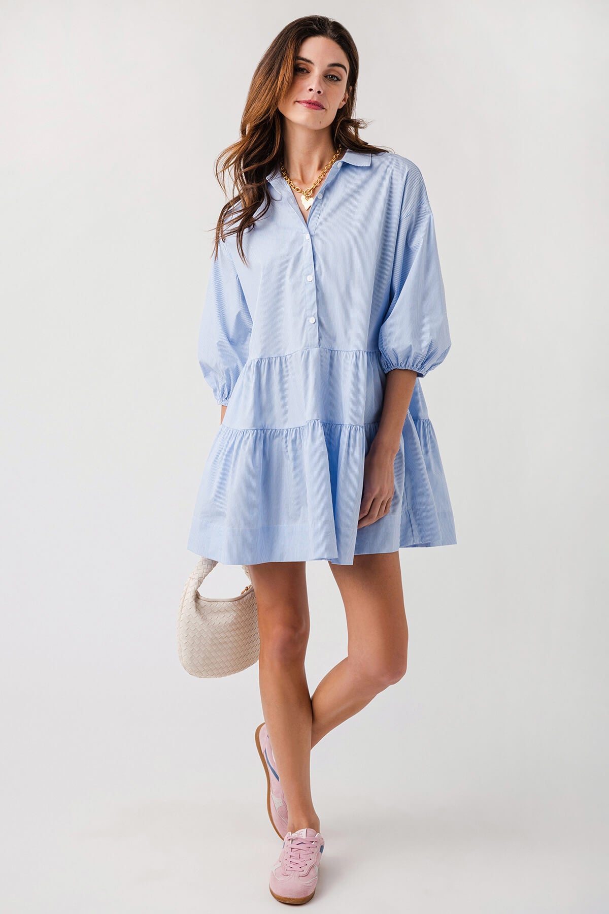 Pinstripe Puffed-sleeve Shirt-style Mini Dress