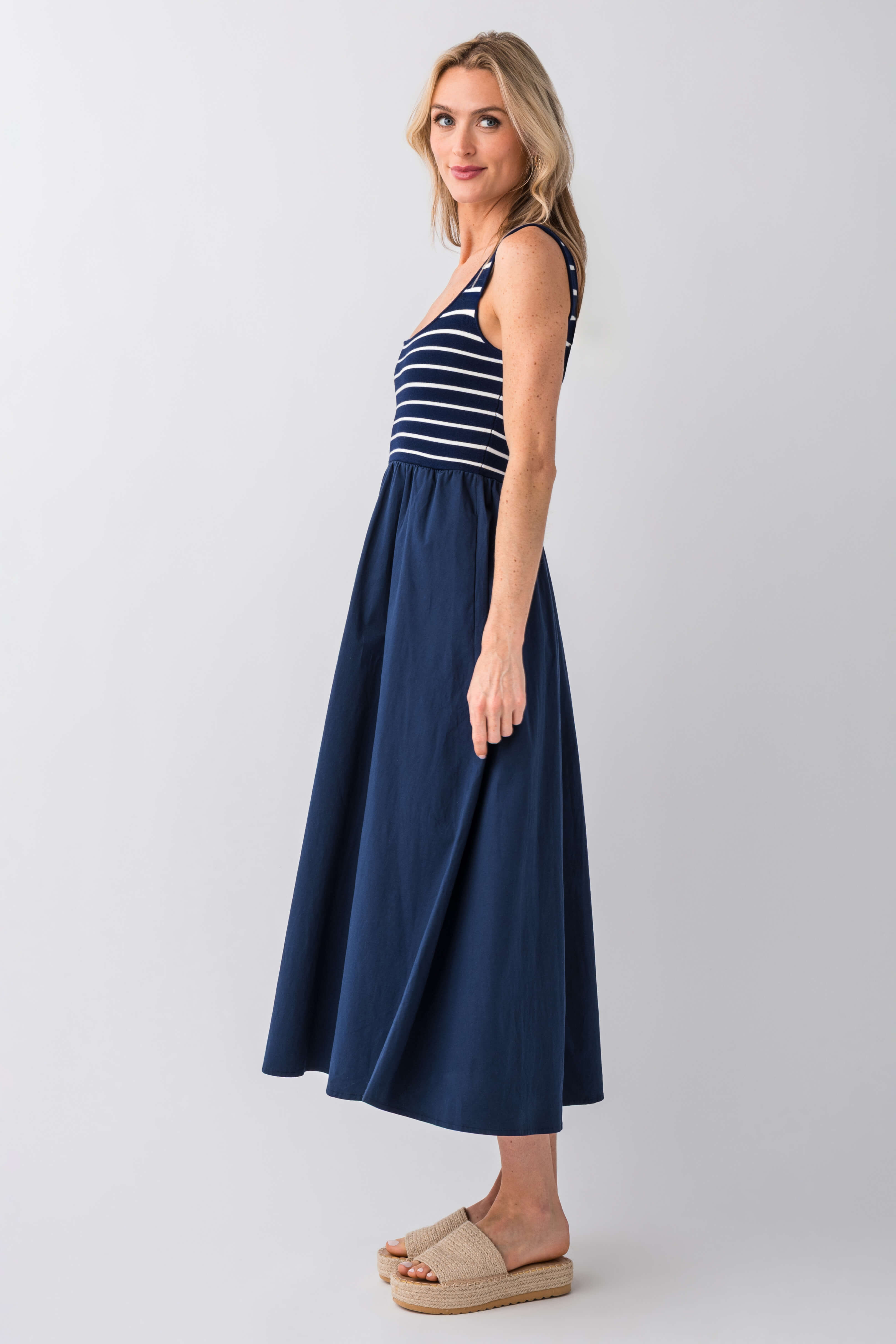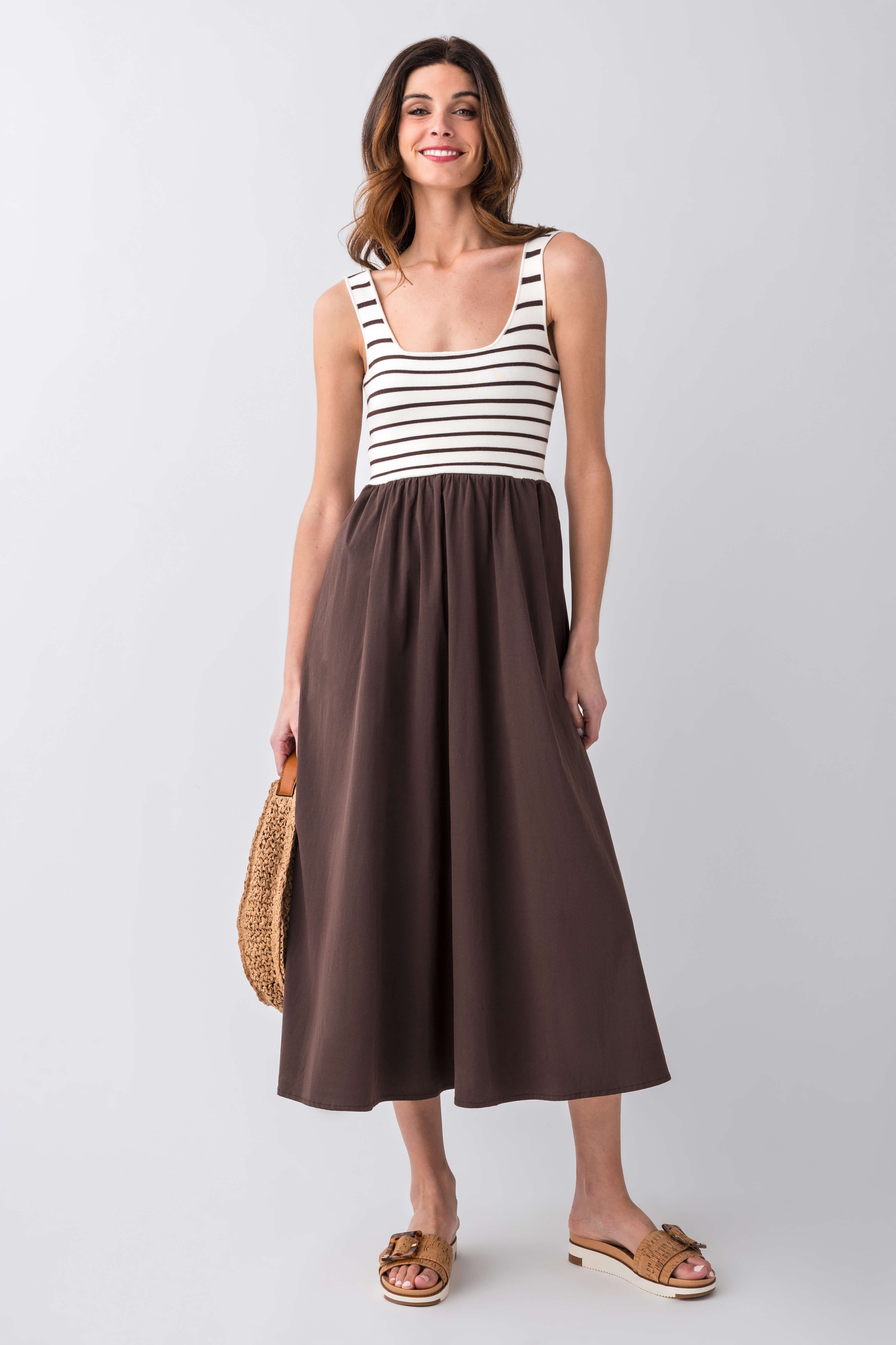 This midi dress is a perfect blend of style and comfort. It features a form – fitting striped knit bodice that transitions to a pleated, flared midi skirt. The square neckline and thin straps add a touch of elegance, while the practical side pockets offer functionality. Available in two colorways, it’s suitable for various warm – weather occasions.