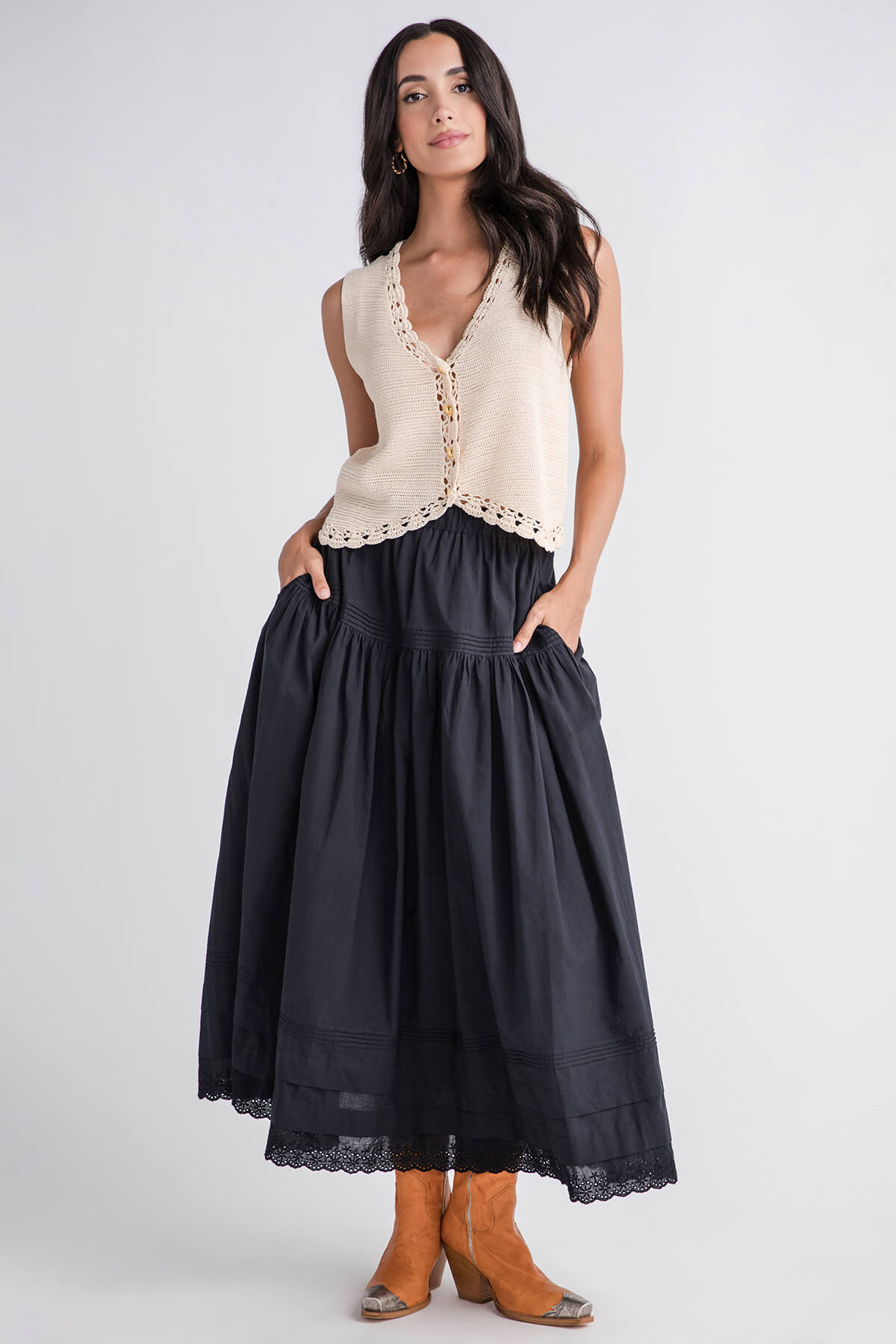 This sleeveless cropped top, resembling a vest, offers a delicate take on a western silhouette. It features a V – neckline and a front button placket, with scalloped lace trim along the neckline, hem, and front edge. The lightweight, textured knit fabric of the main body is complemented by the intricate lace trim, making it suitable for various seasons and styles.