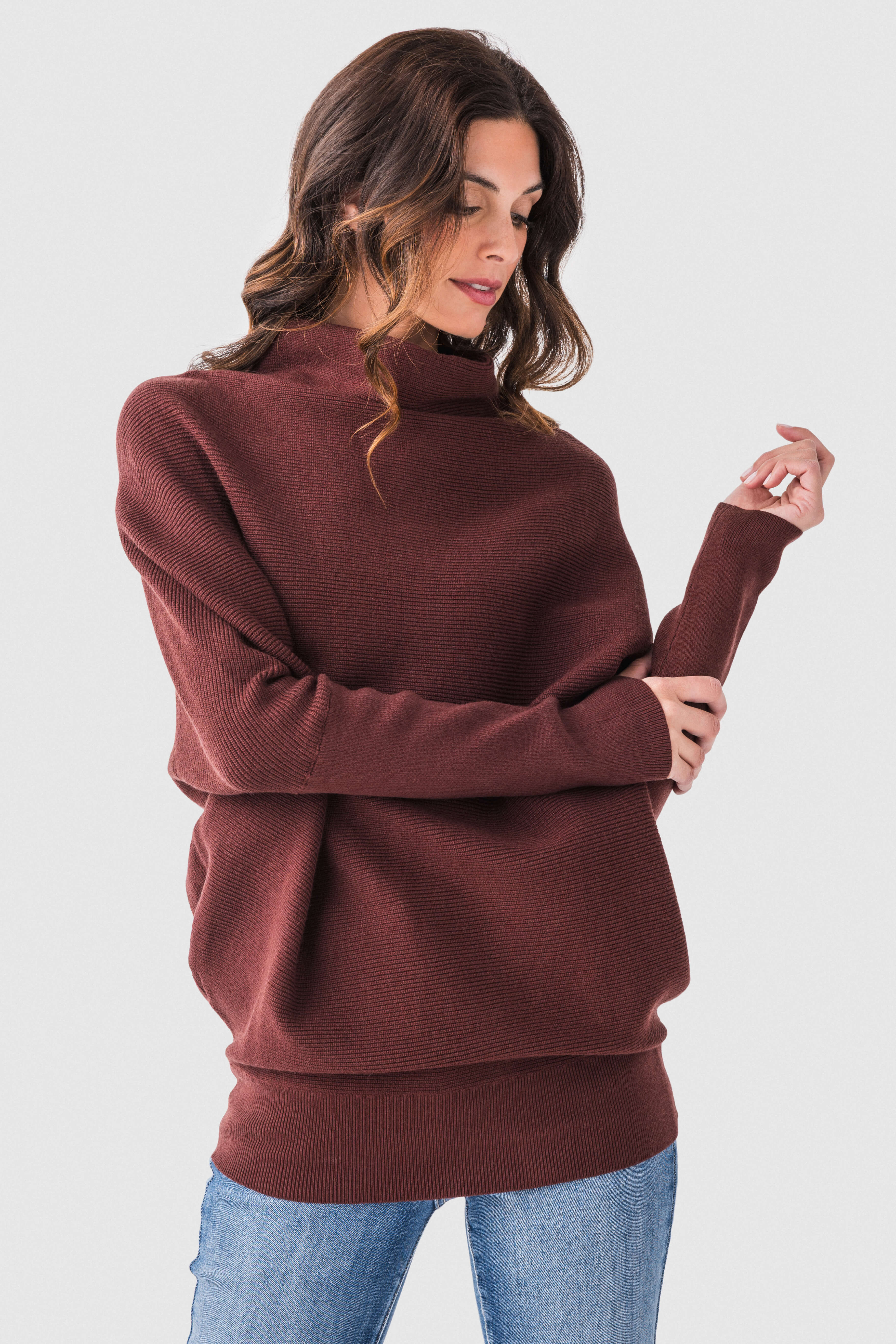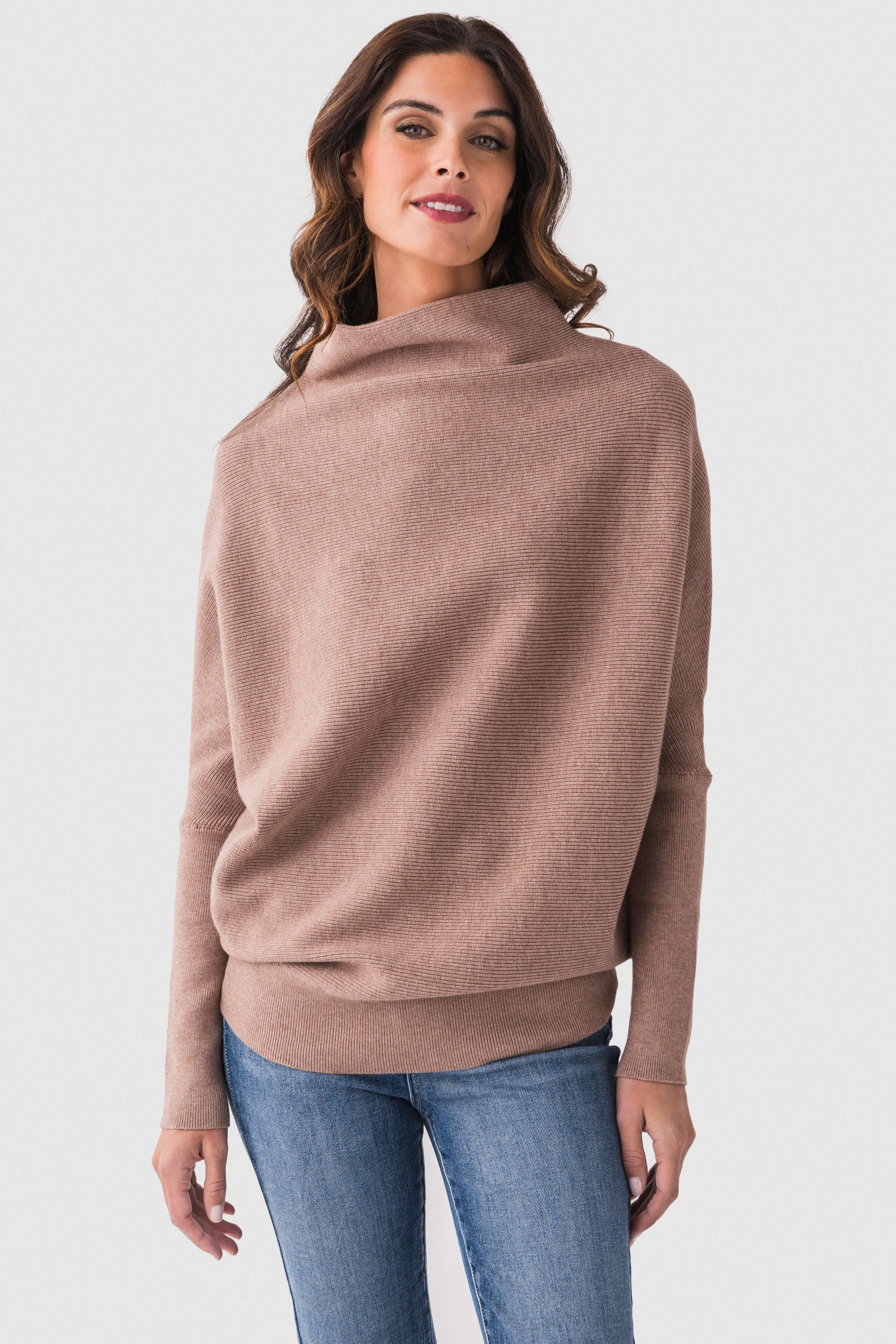 This women’s knit sweater is a must – have for the fall season. It features an oversized, relaxed silhouette with long dolman sleeves and a high, draped cowl neckline. Crafted from a soft, fine – knit fabric blend, it offers both warmth and comfort, making it suitable for various occasions.