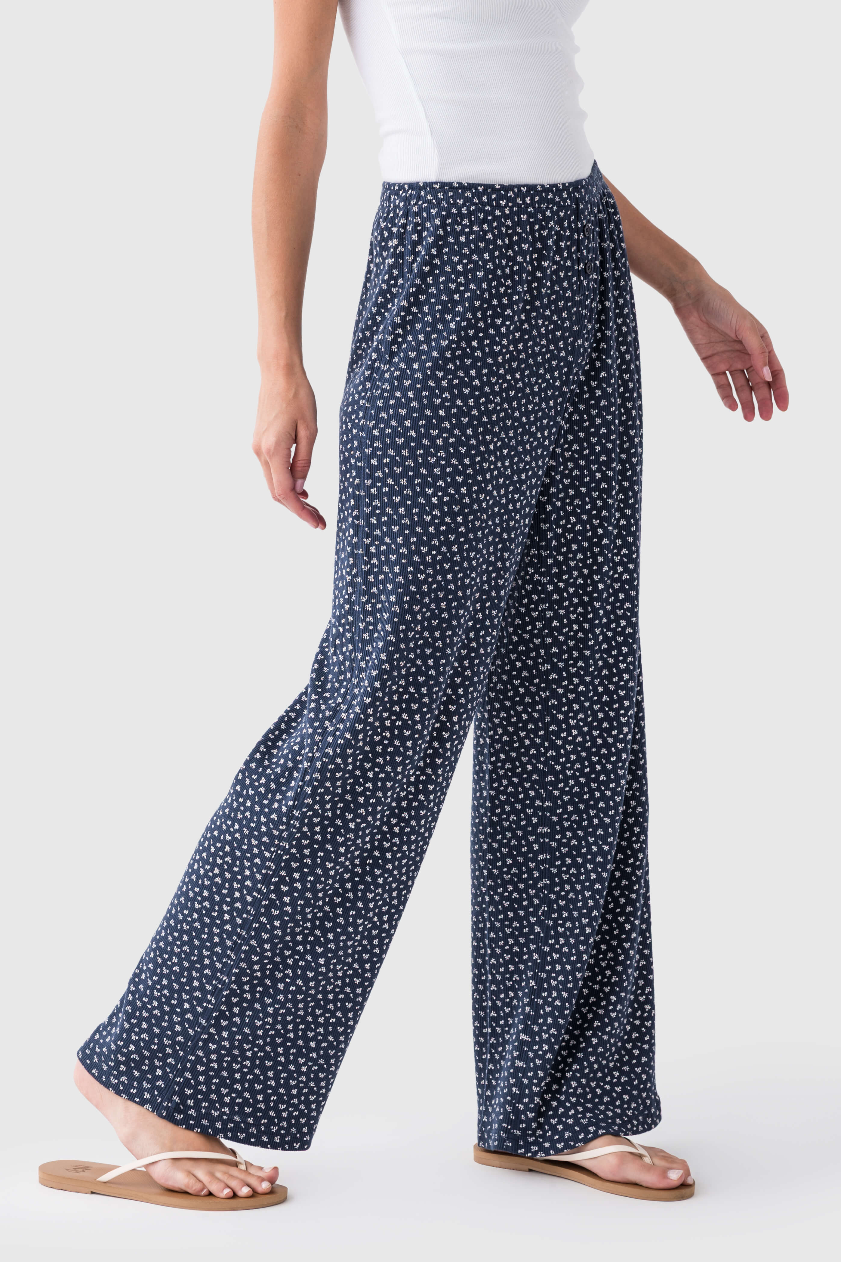 These women’s wide – leg pants feature a deep navy base color with small white floral motifs scattered across the fabric. The lightweight, soft knit fabric has a subtle texture and is stretchy and breathable. The structured front waistband with buttons adds a tailored touch to the relaxed, flowing silhouette.
