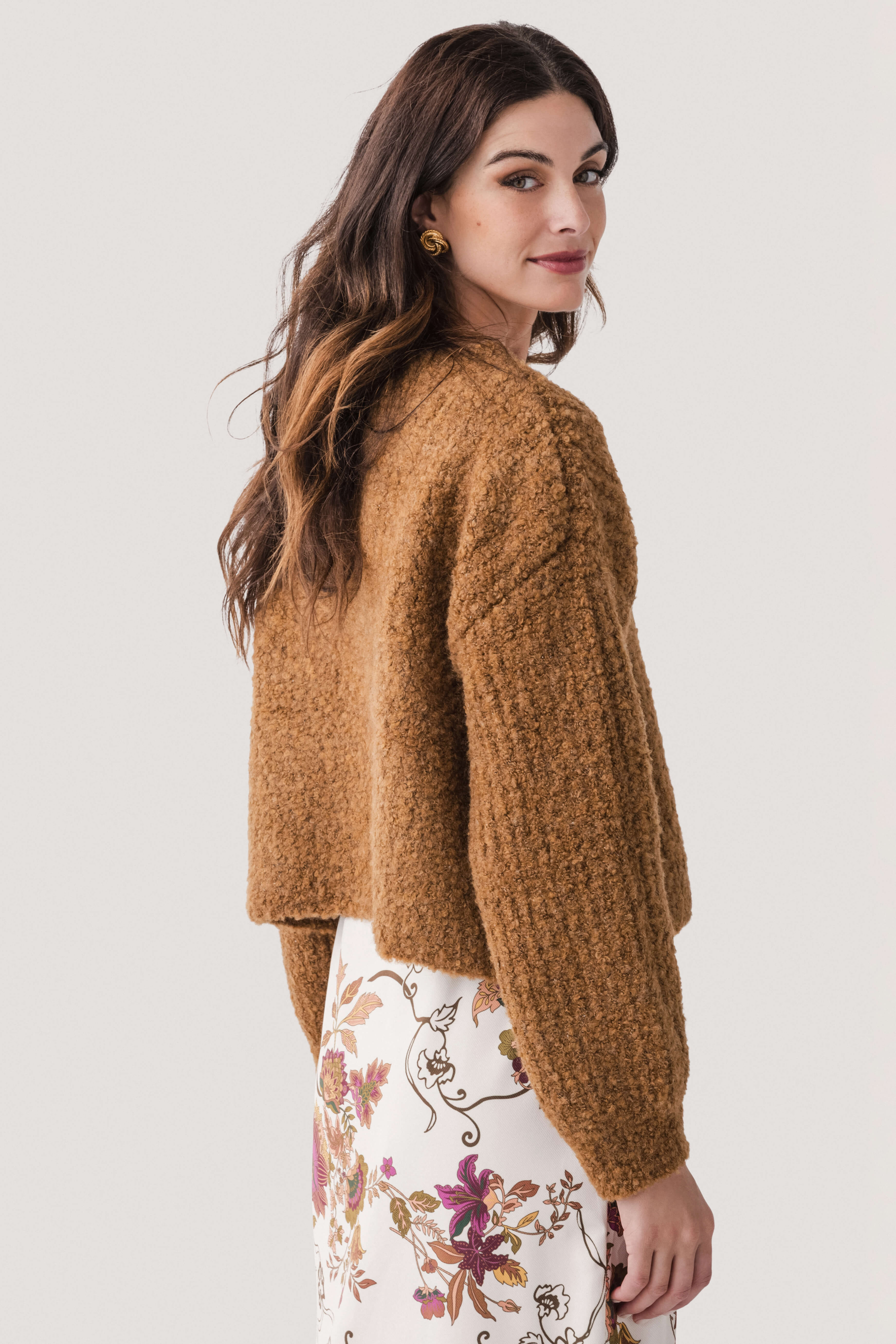 This is a stylish cropped plush cardigan that offers a cozy and comfortable fit. With its textured, fuzzy – like yarn and light – colored button details, it adds a touch of sophistication. The cardigan’s cropped length makes it perfect for pairing with high – waisted bottoms, suitable for both casual and dressed – up looks.