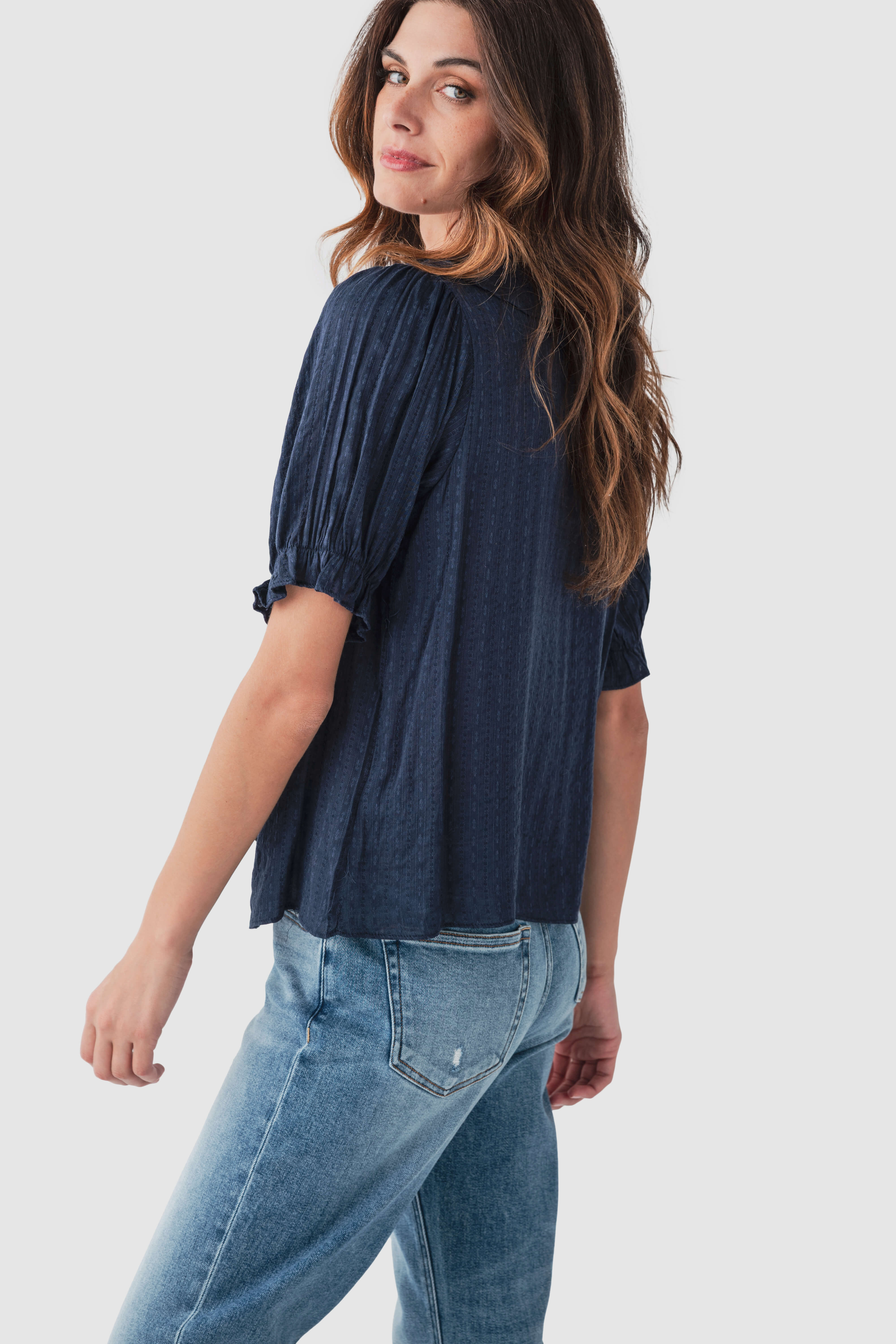 - Long sleeves with ribbed cuffs to retain shape