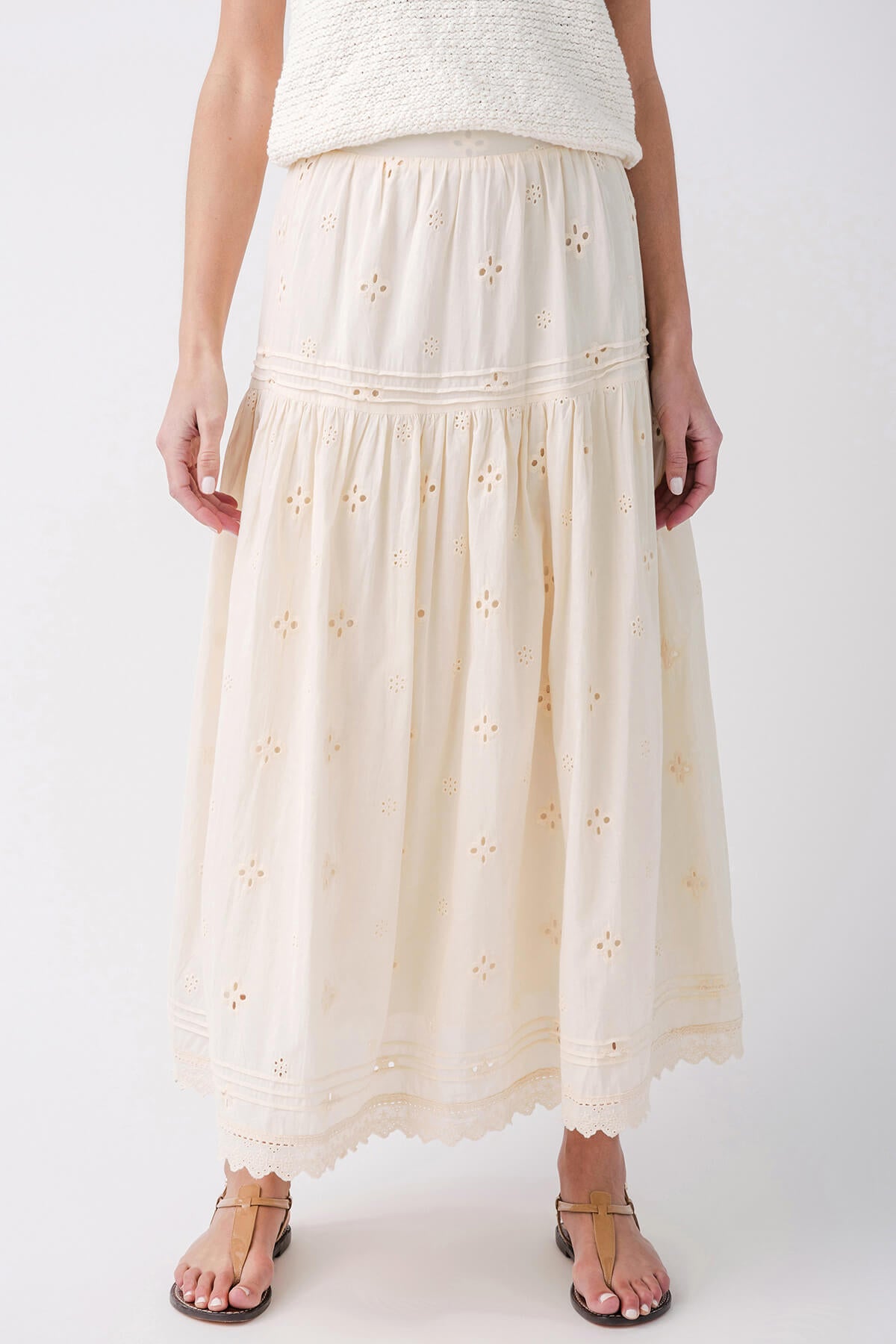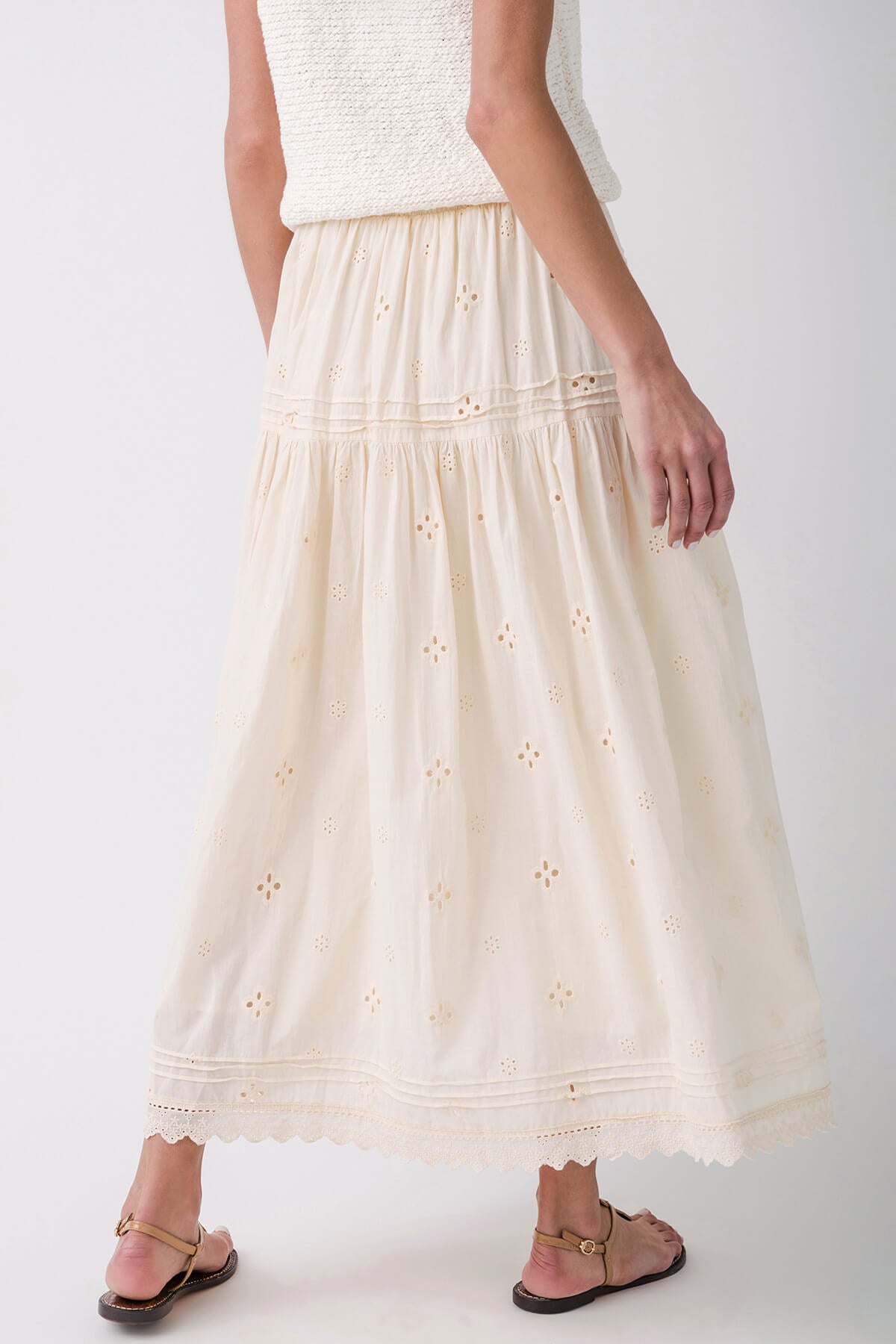 This women’s maxi skirt is a vision of femininity and style. It features a flowy, tiered silhouette crafted from a lightweight, breathable fabric with all – over eyelet cutouts. The scalloped lace hem adds a delicate touch, making it a standout piece for various occasions.