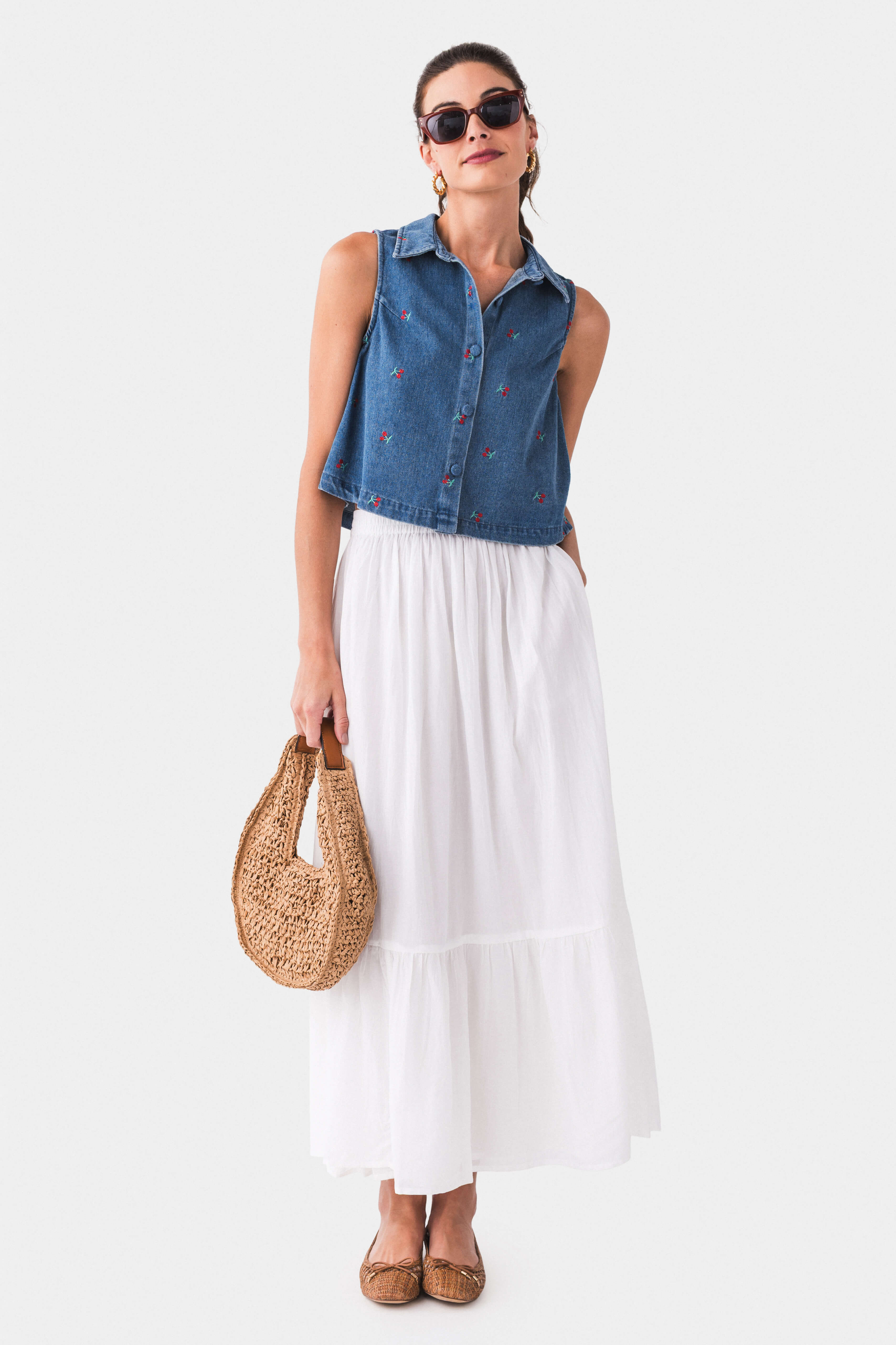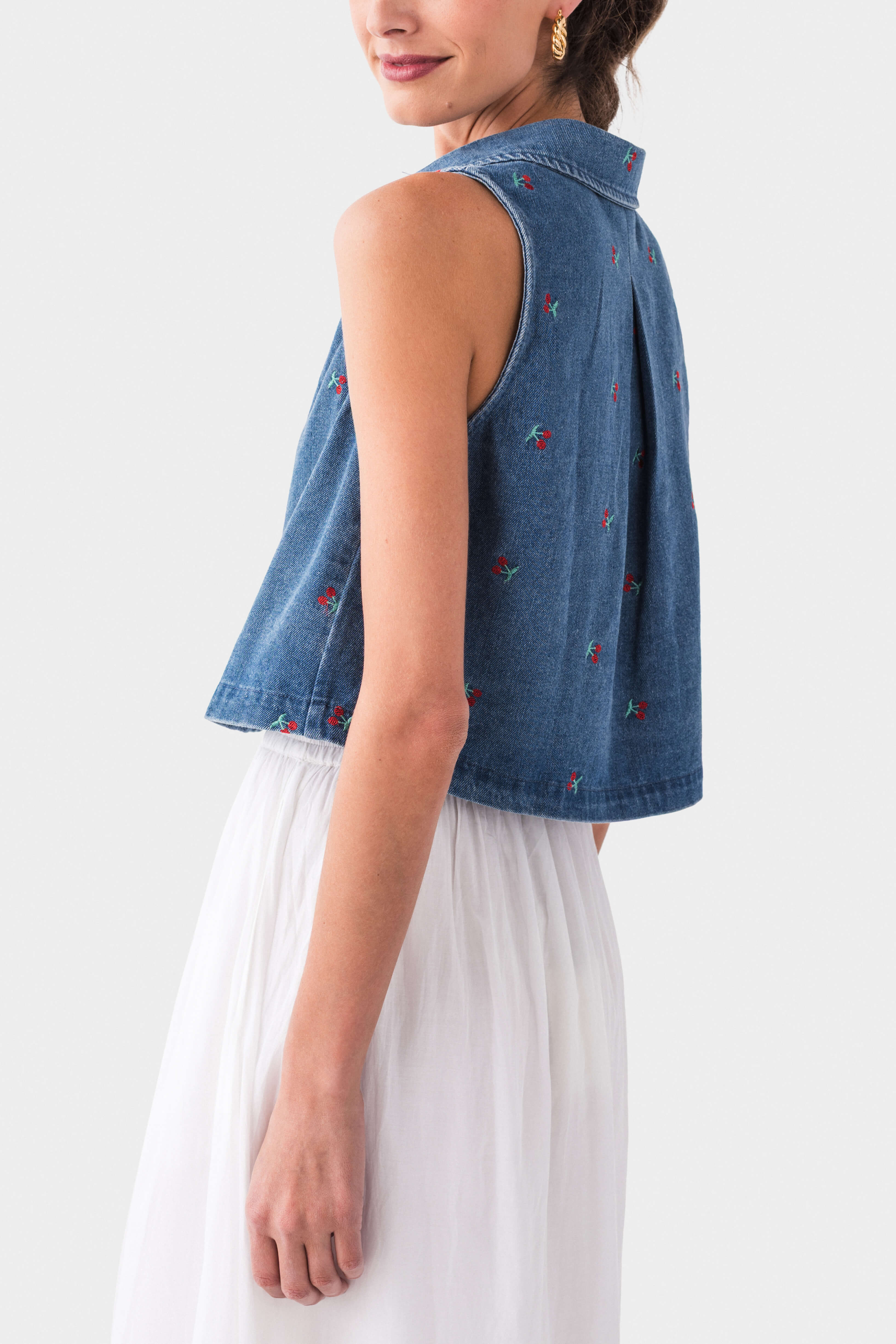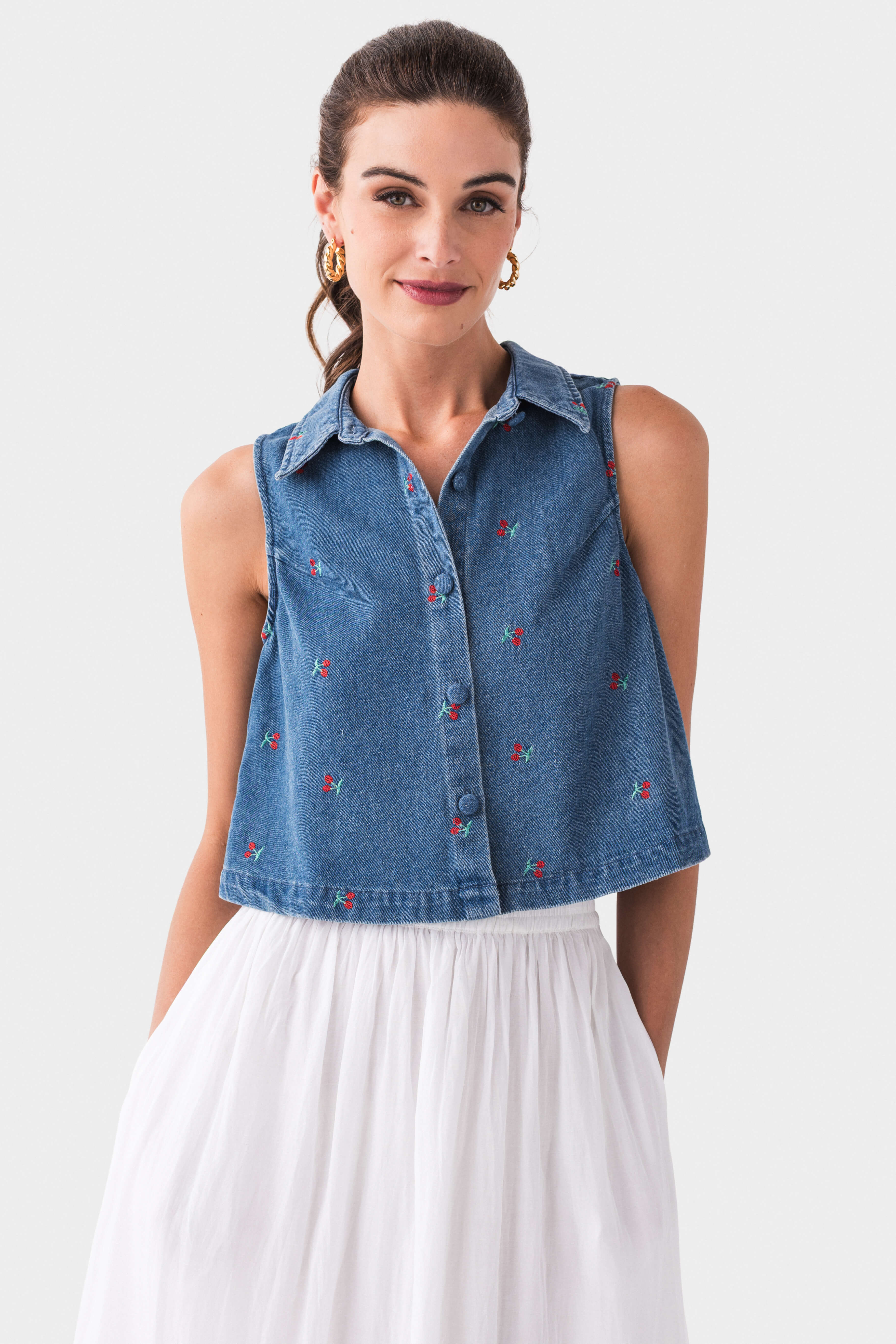 This cropped denim tank is a stylish addition to any wardrobe. It features a collared neckline and button – front closure, making it look like a polished shirt. The medium – blue denim is adorned with red embroidered motifs, adding a touch of playfulness, and it pairs well with a variety of high – waisted bottoms.