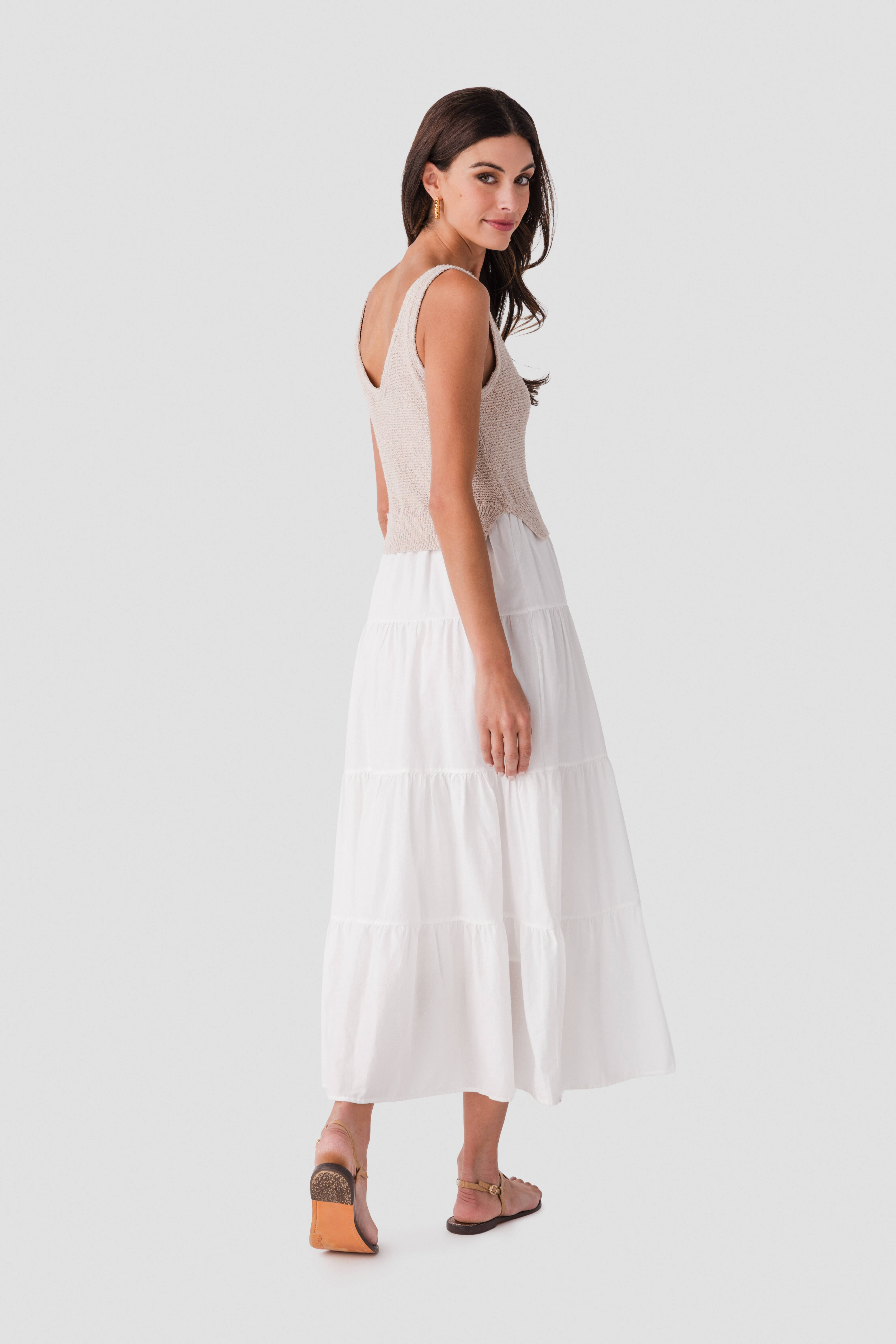 - Structured silhouette with a knit bodice for shape and a tiered skirt for movement