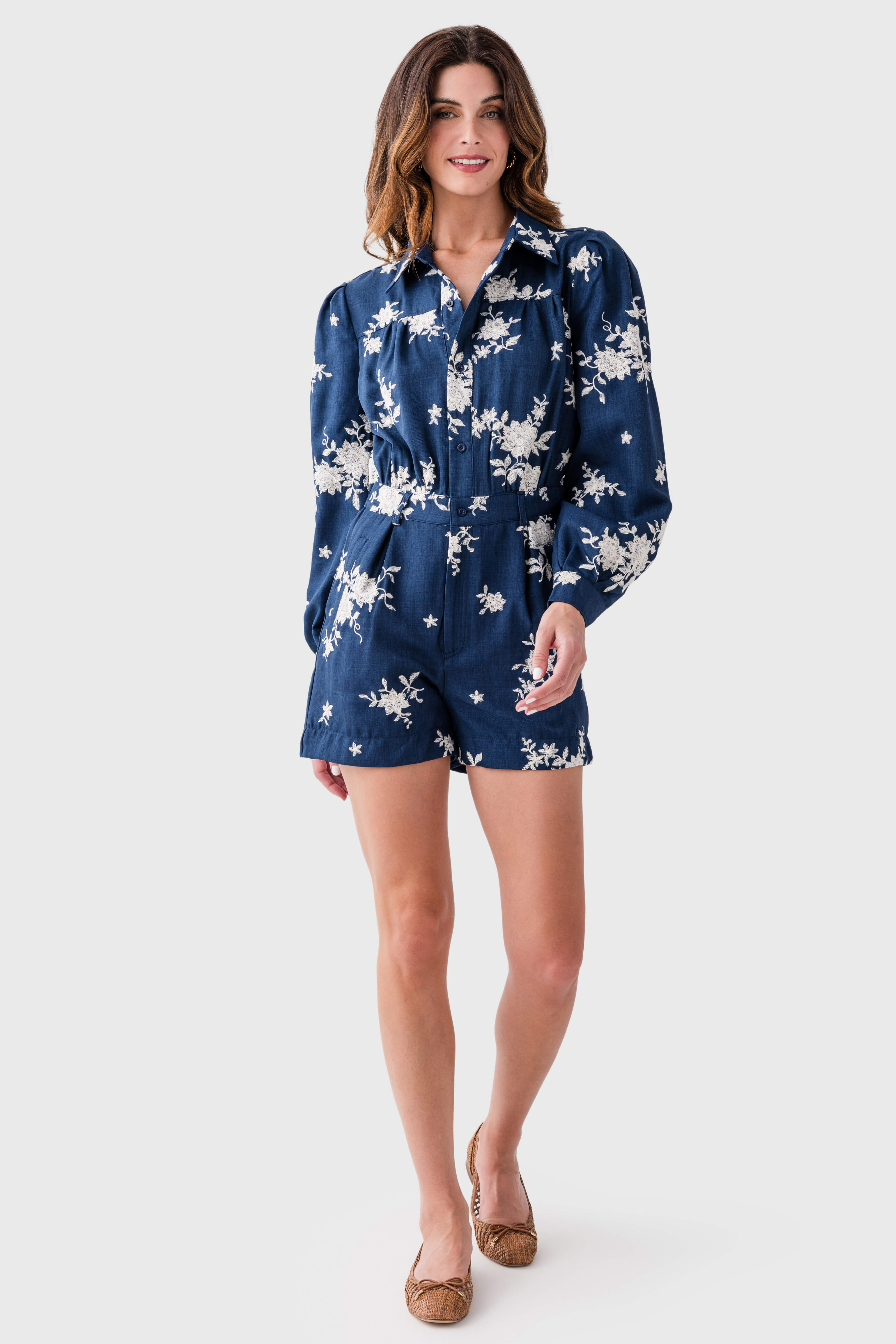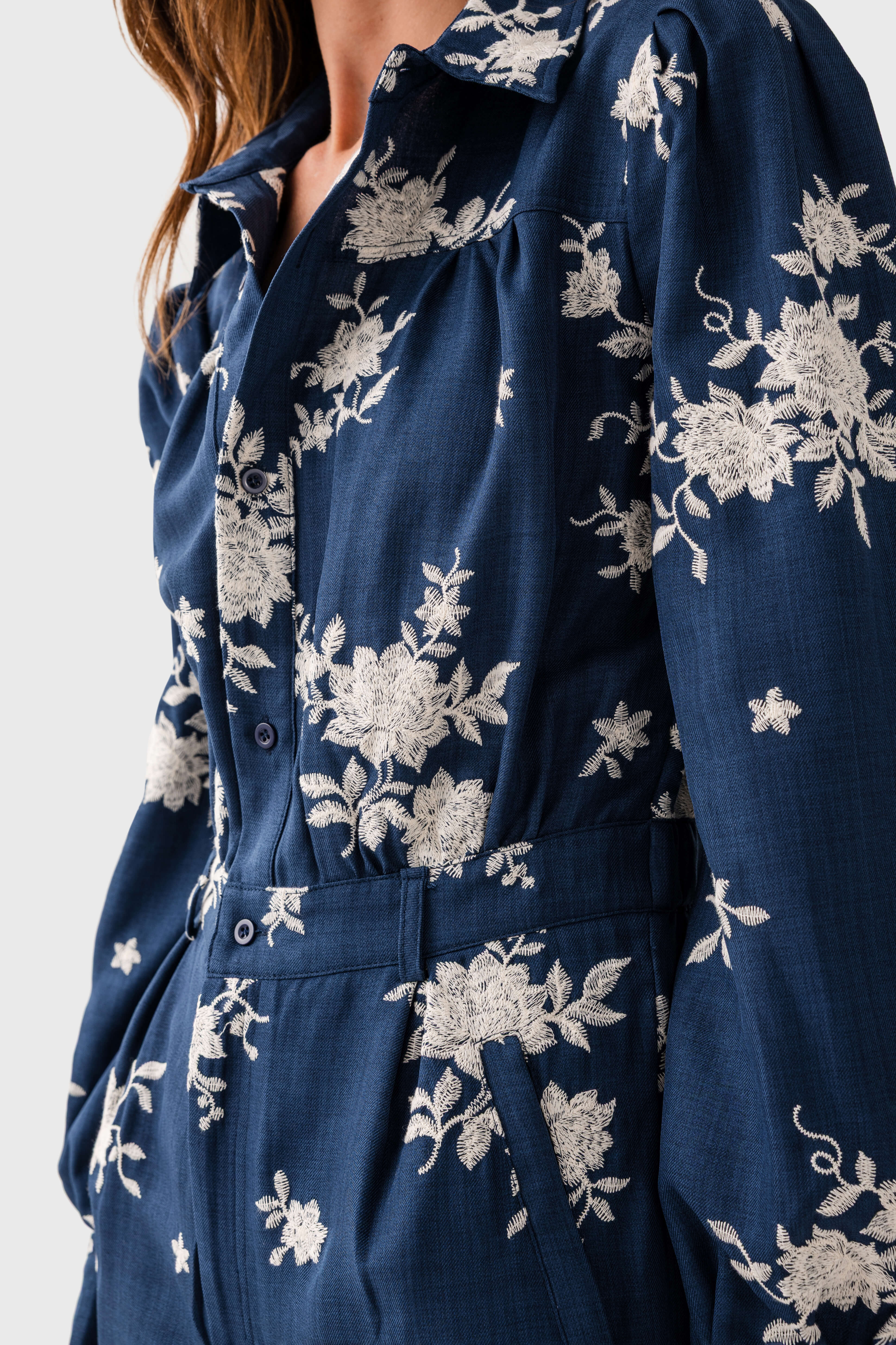 This women’s romper is a stylish and practical choice for various occasions. It features a deep navy base color adorned with white floral embroidery, creating an eye – catching look. The puffed sleeves and collared neckline add a touch of elegance, while the belted waist and front pockets enhance its functionality.