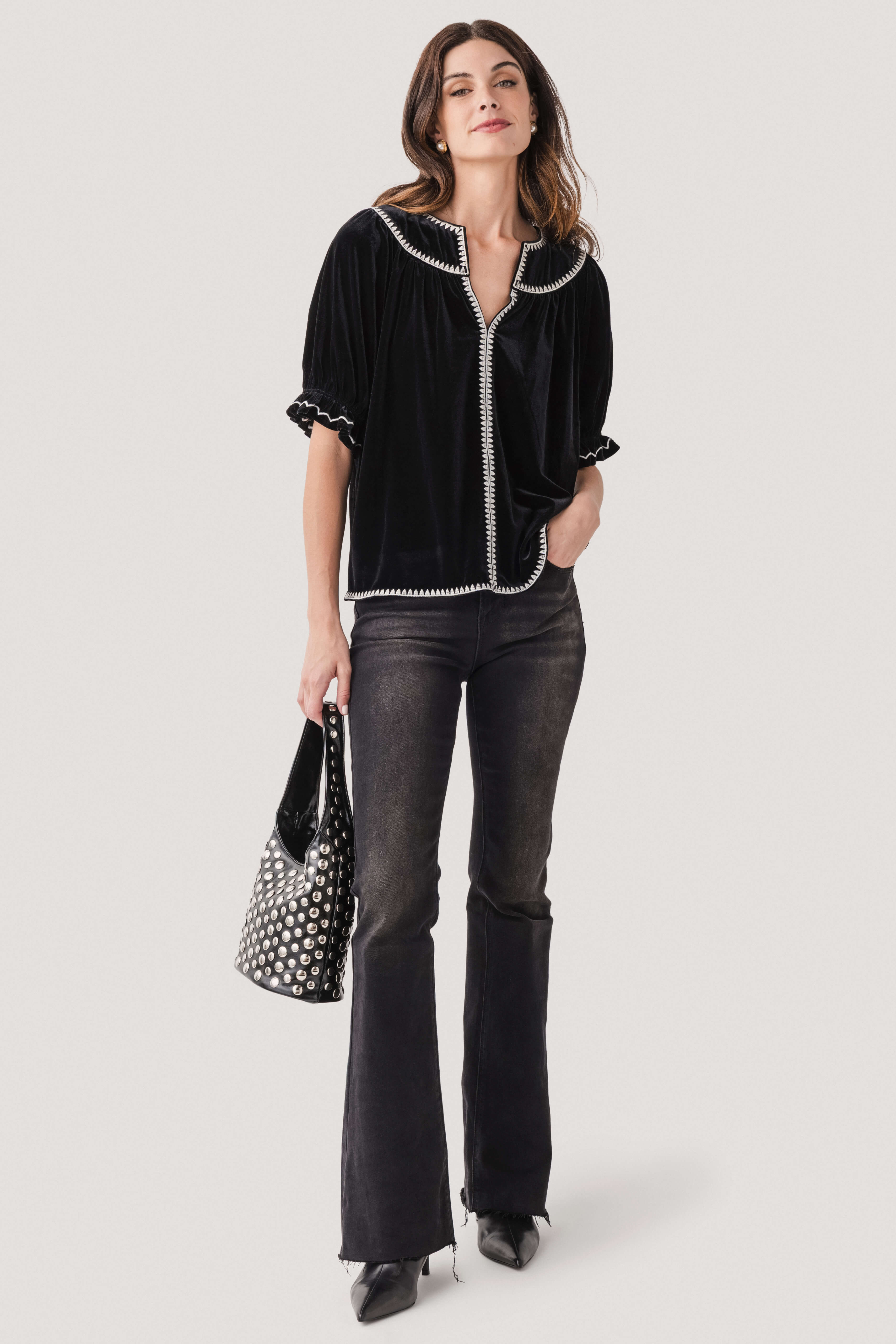 This women’s blouse is a perfect blend of style and comfort. Crafted from a plush velvet – like fabric, it features a striking black color with white geometric trim. The short puffed sleeves and V – neck design add a touch of elegance, making it suitable for both casual and dressy occasions.