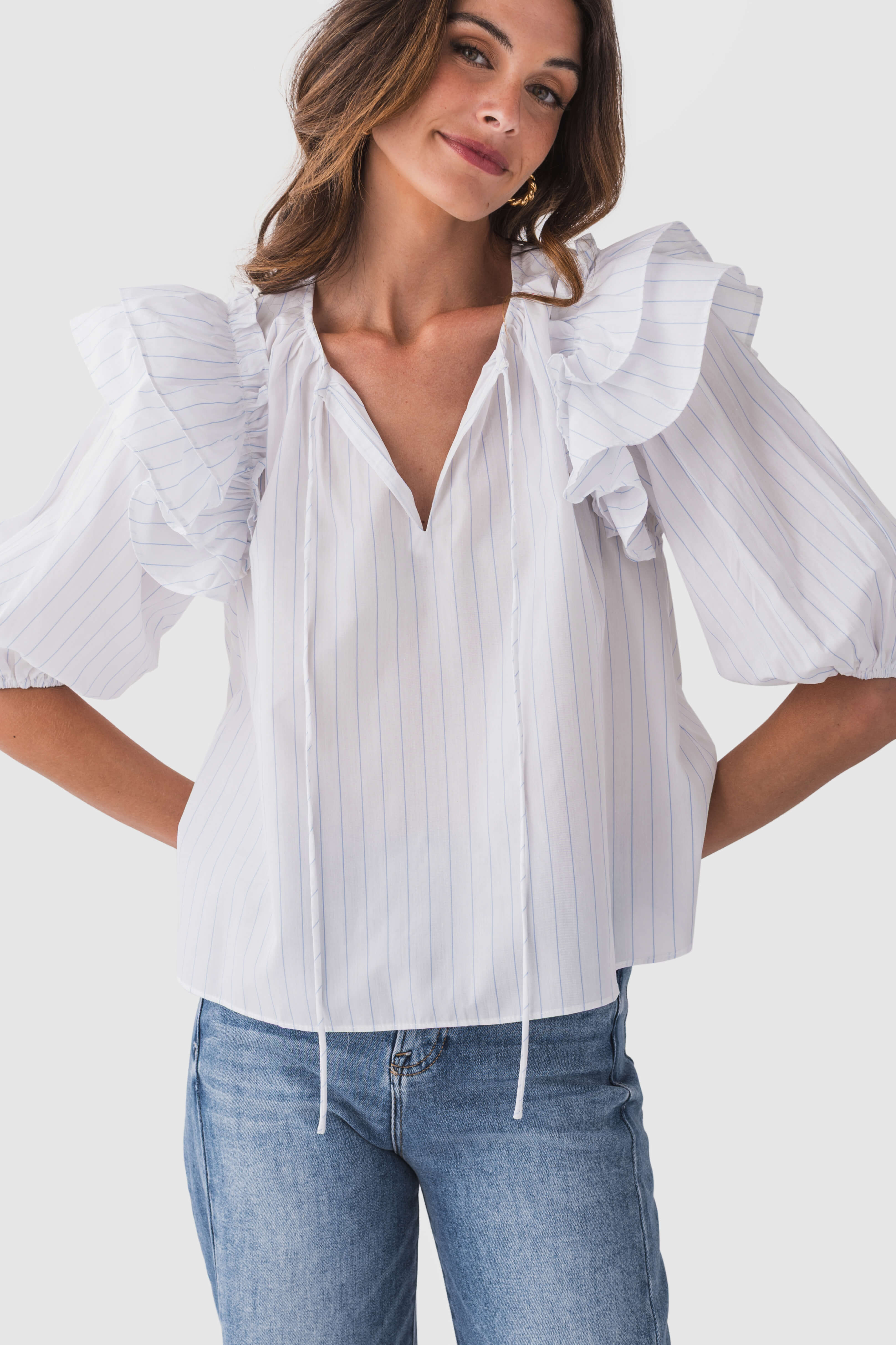This women’s blouse is a perfect blend of style and comfort. It features a white base with thin blue vertical stripes, along with feminine details like ruffled shoulders and puffed sleeves. The V – neck with drawstrings allows for adjustable comfort, and the relaxed, slightly cropped hemline gives it a trendy look. Ideal for various occasions, it’s made of a lightweight, breathable cotton blend.