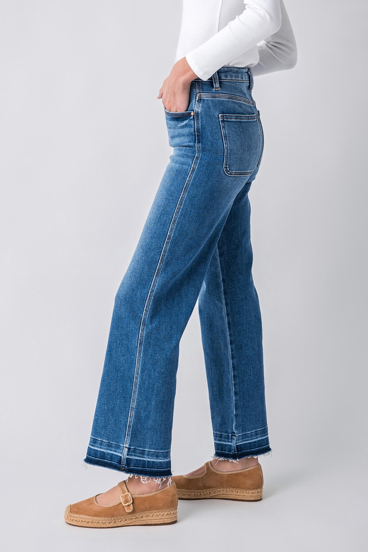 - Frayed, raw – edge cropped hem for a trendy, casual finish