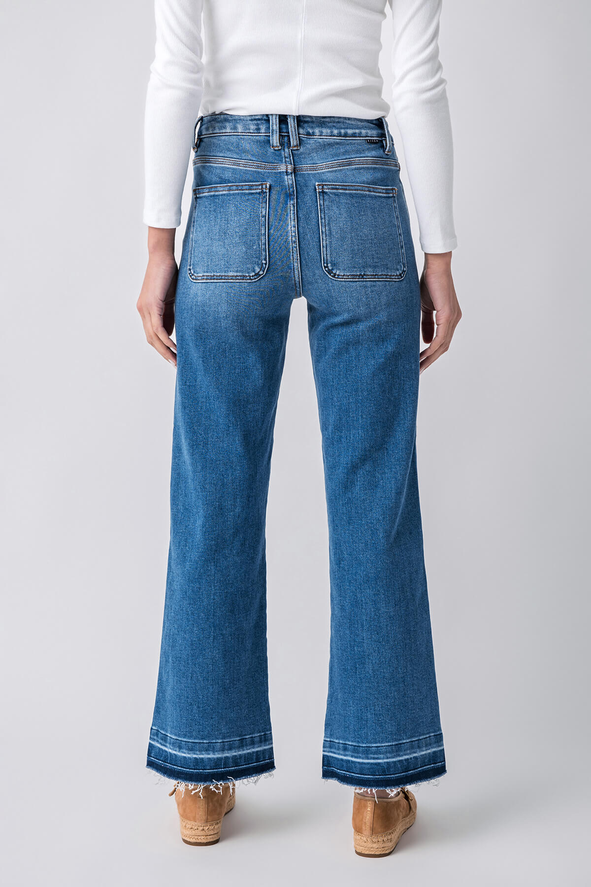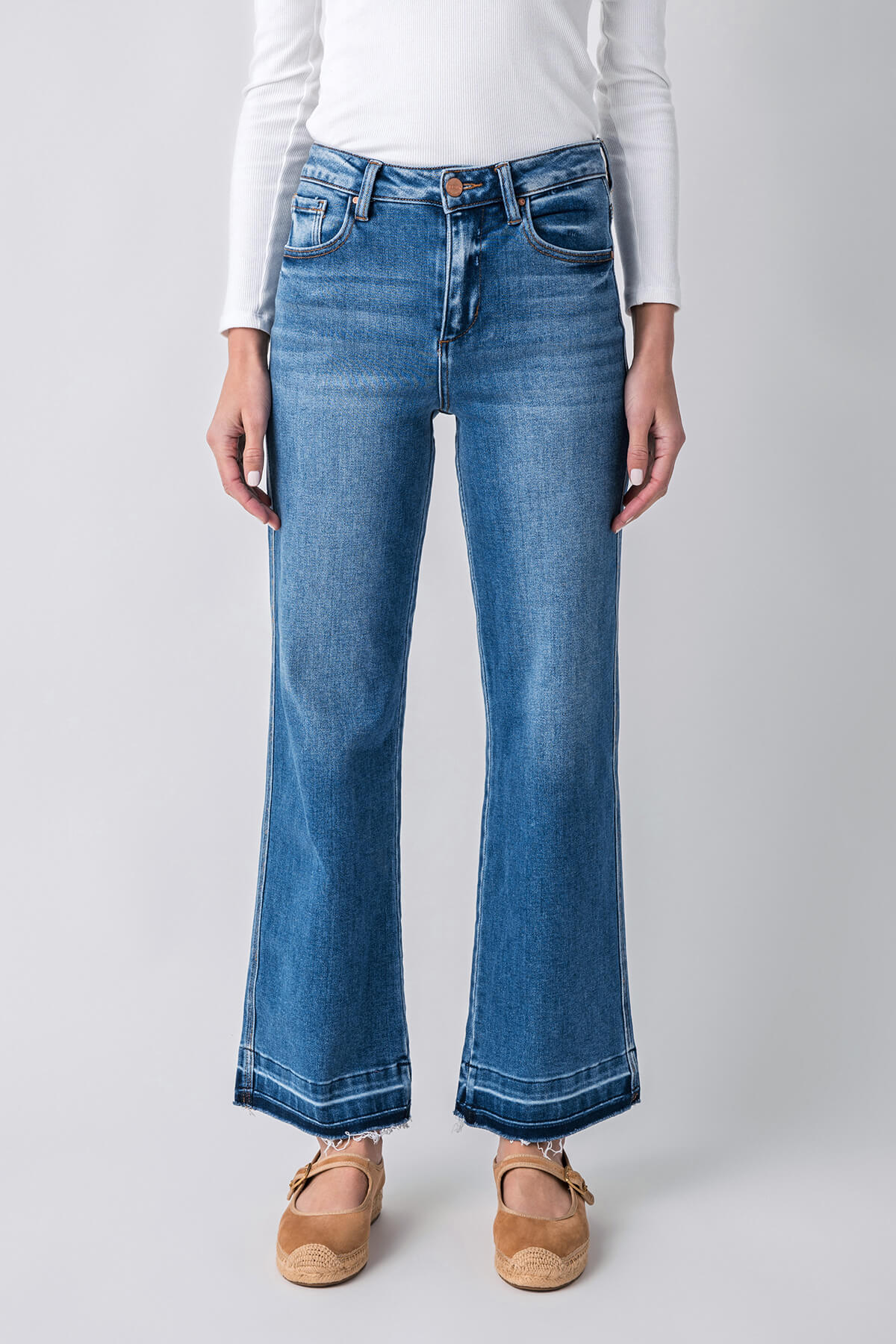 These women’s denim jeans are a stylish addition to any wardrobe. With a high – rise, wide – leg silhouette and cropped, frayed hems, they offer a trendy and comfortable look. The medium blue faded wash gives them a vintage charm, and the white topstitching adds a nice visual detail.