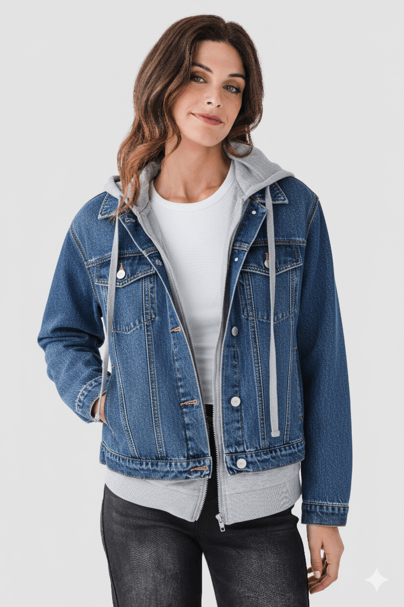 - Hybrid design combining denim and a hoodie for versatility