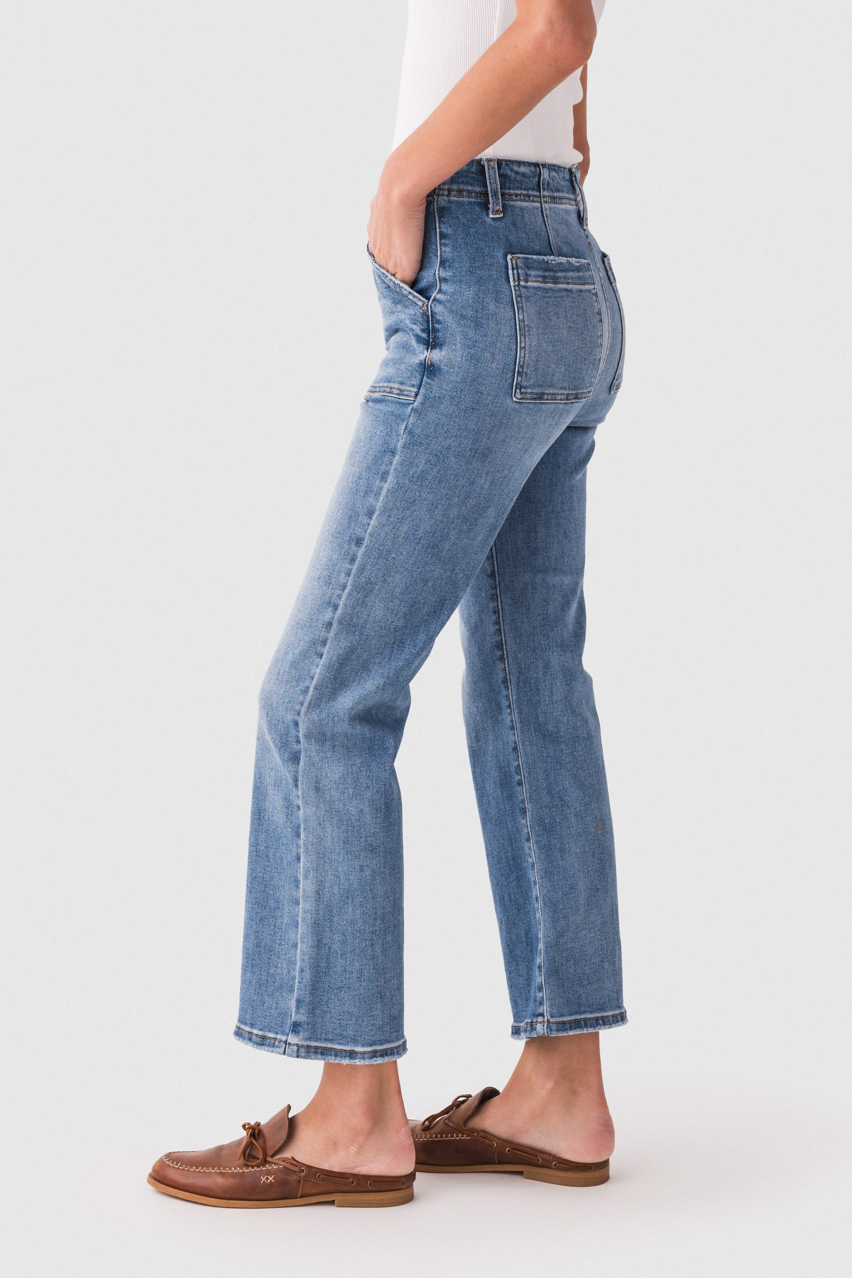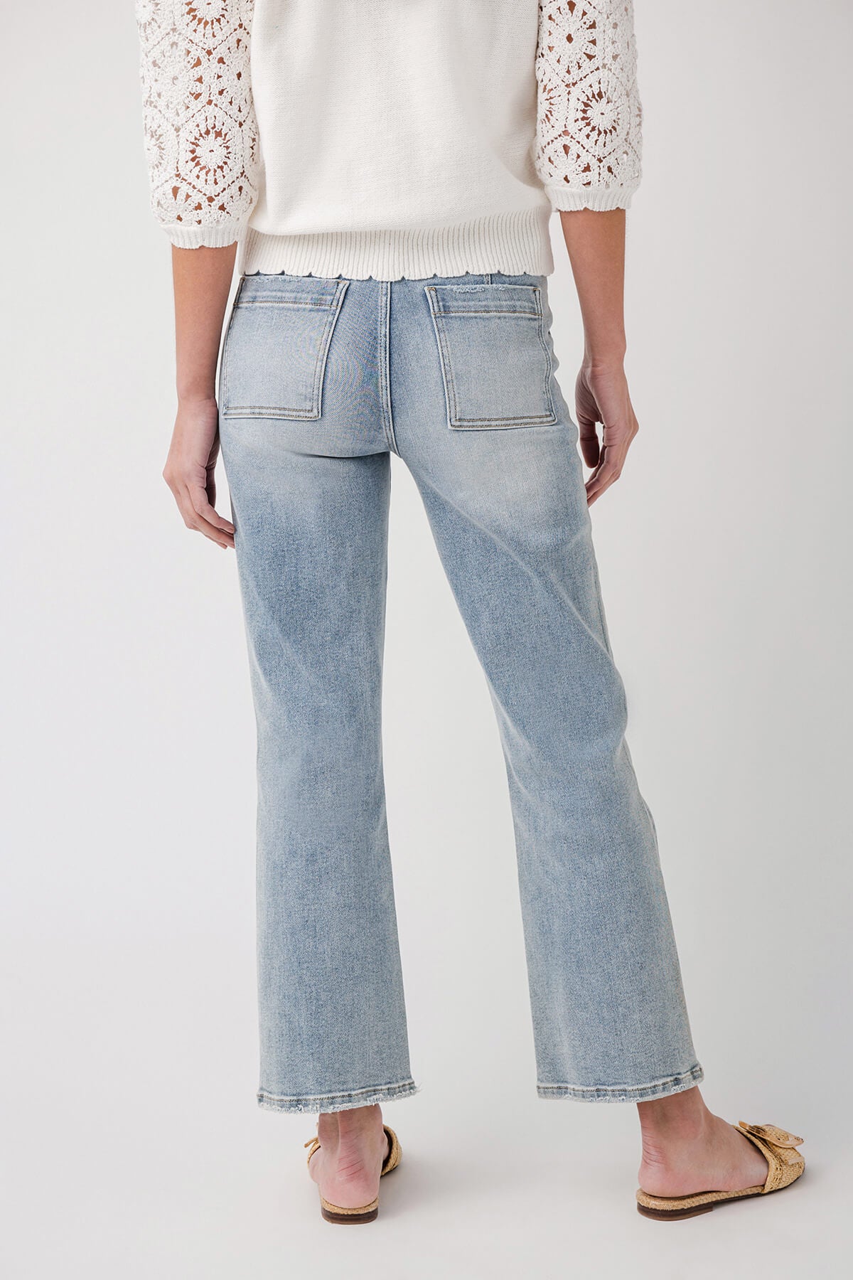 - Frayed hem in a cropped, ankle – grazing length for a trendy aesthetic.