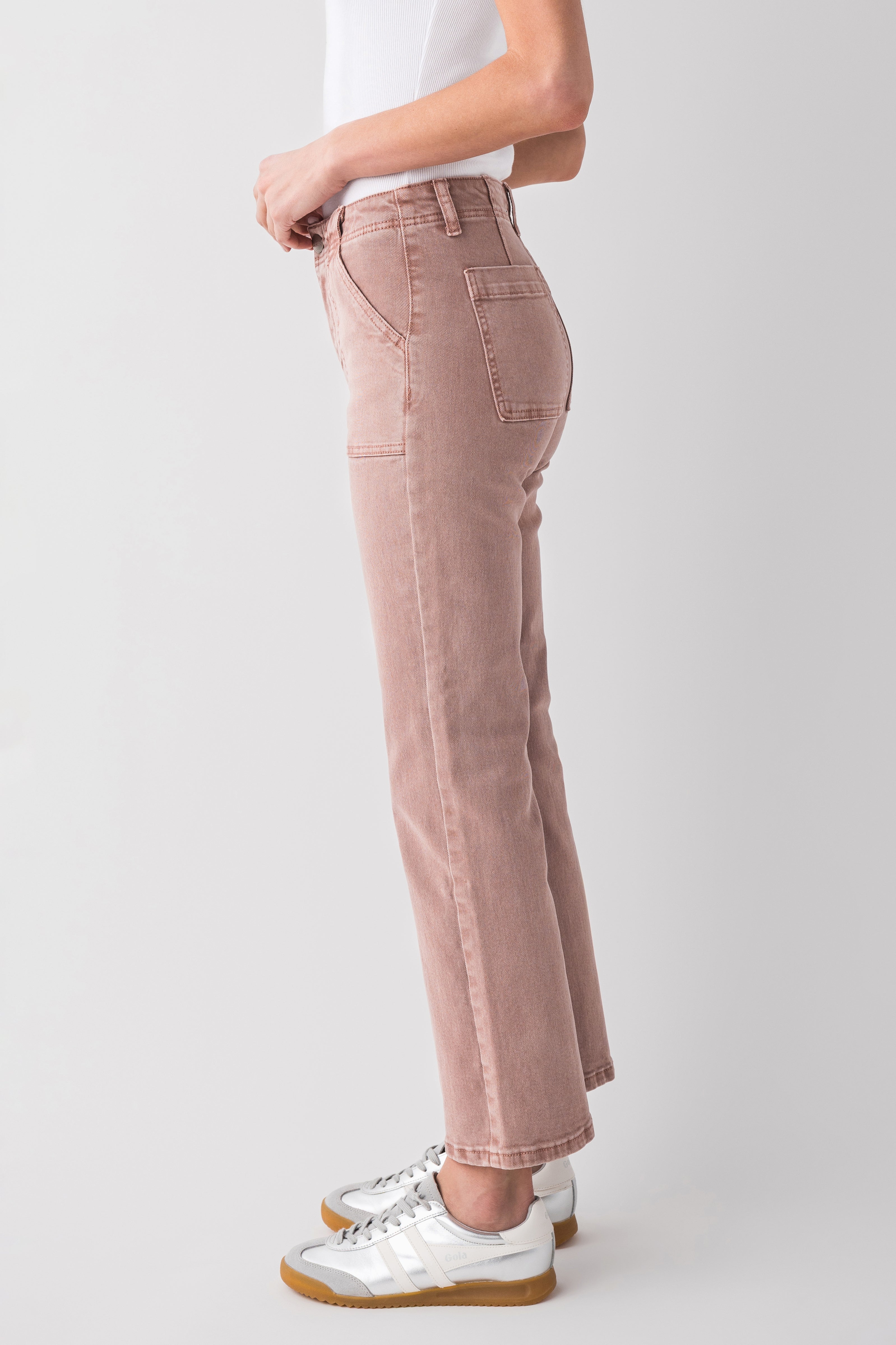 - High – rise waist with belt loops, button, and zipper fly for a classic look and secure closure.