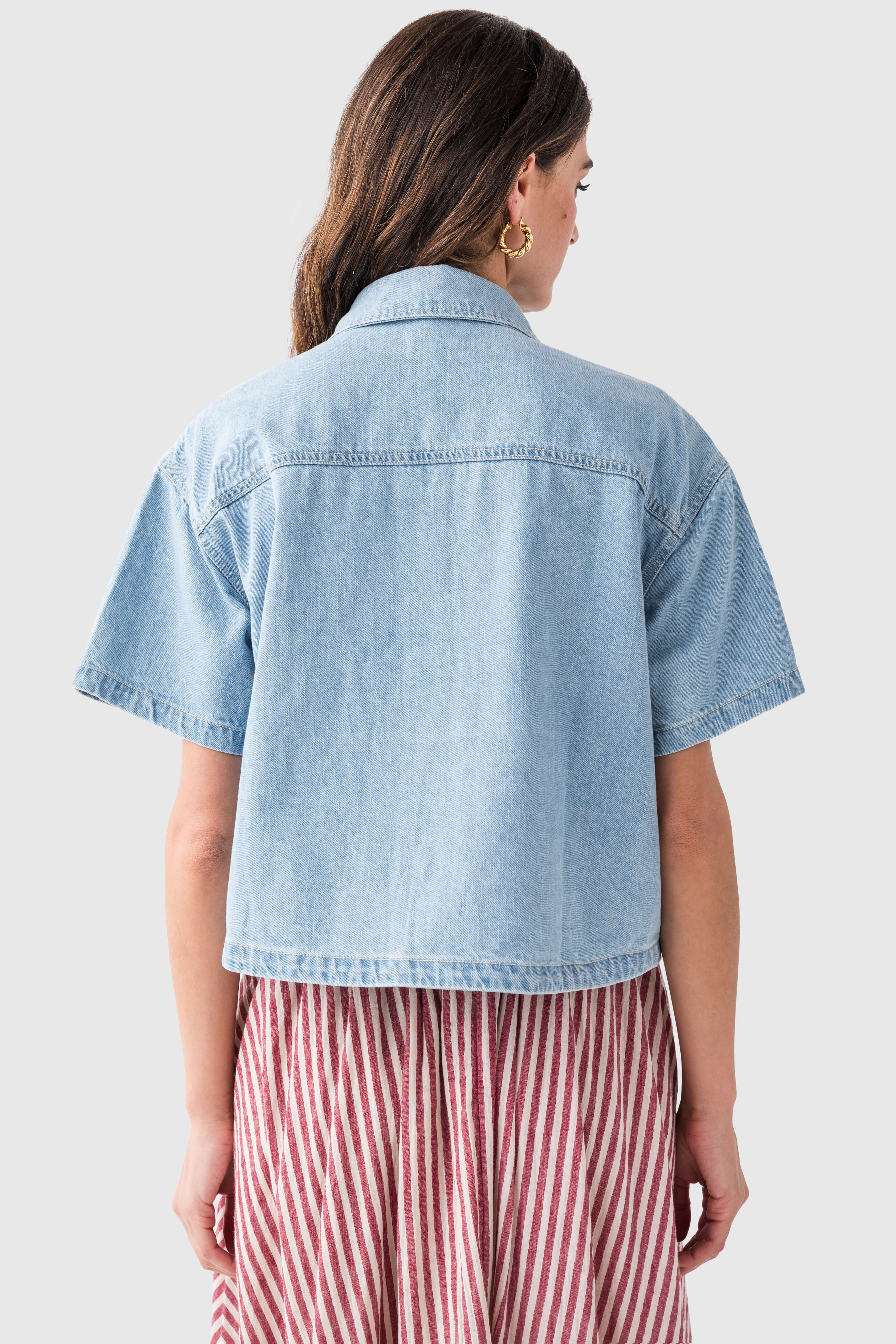 This women’s short – sleeve denim button – up shirt is a perfect blend of style and comfort. With its cropped hem and relaxed fit, it offers a trendy and casual look. The light blue denim fabric with white stitching gives it a classic and durable feel, suitable for various warm – weather outfits.