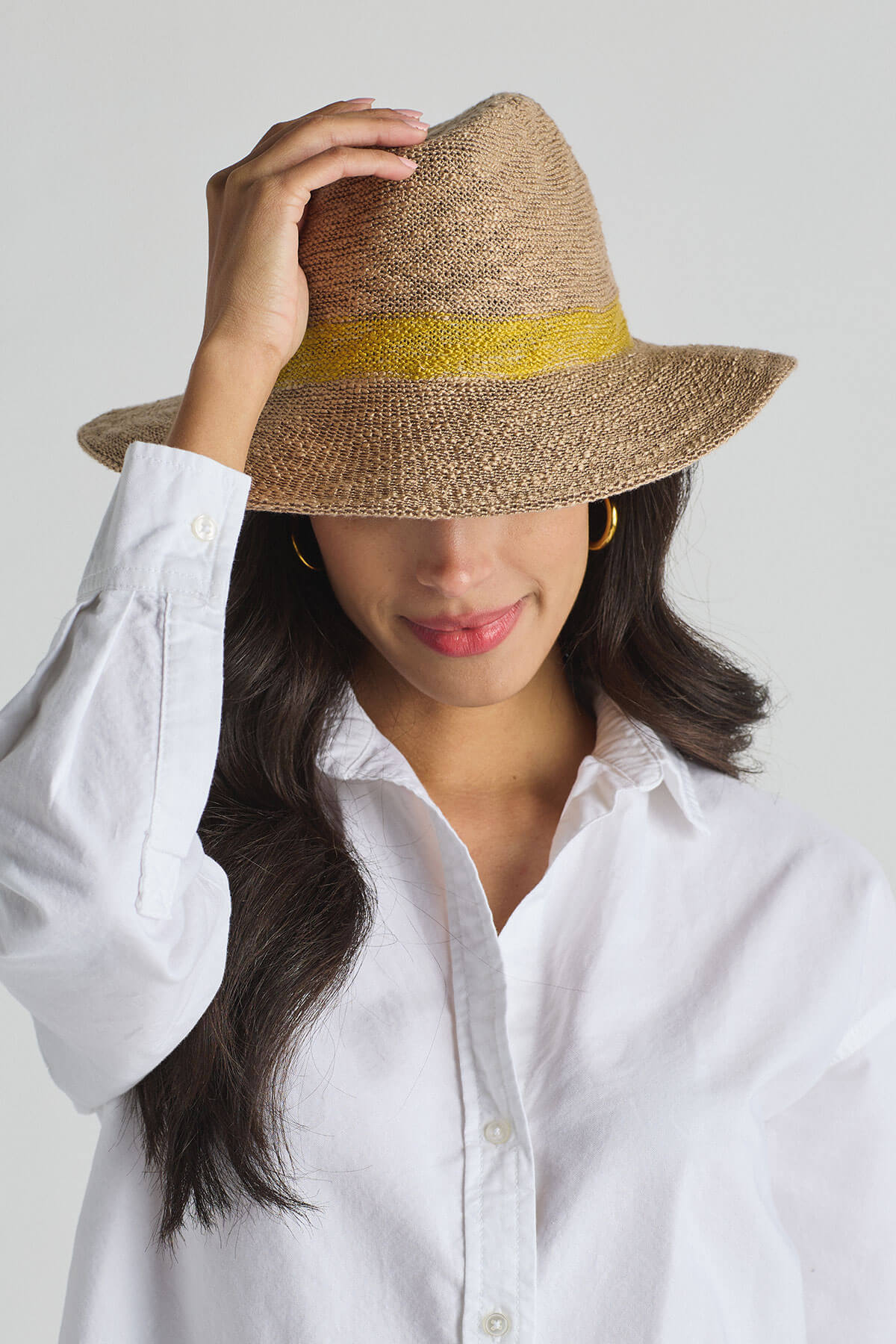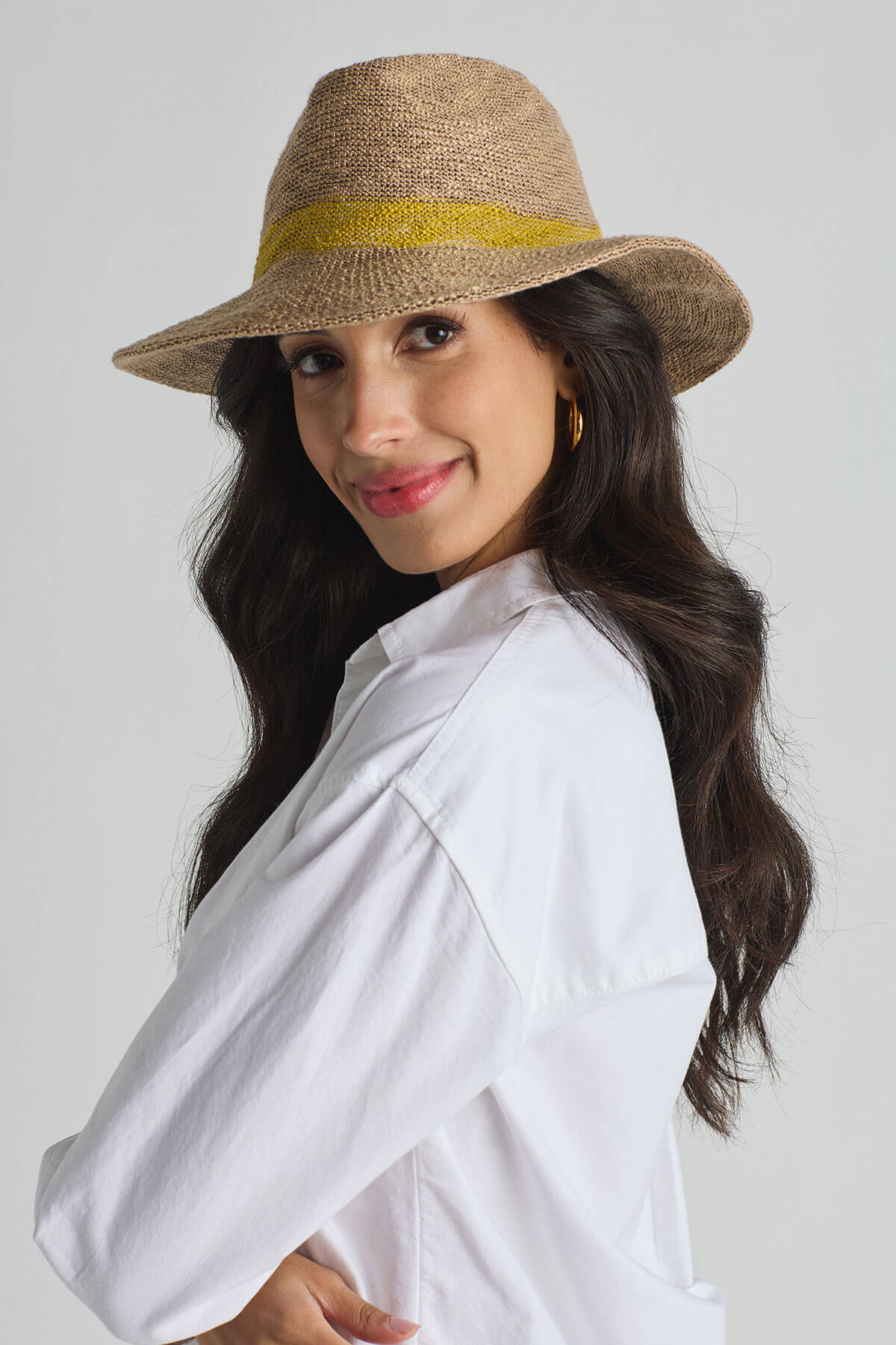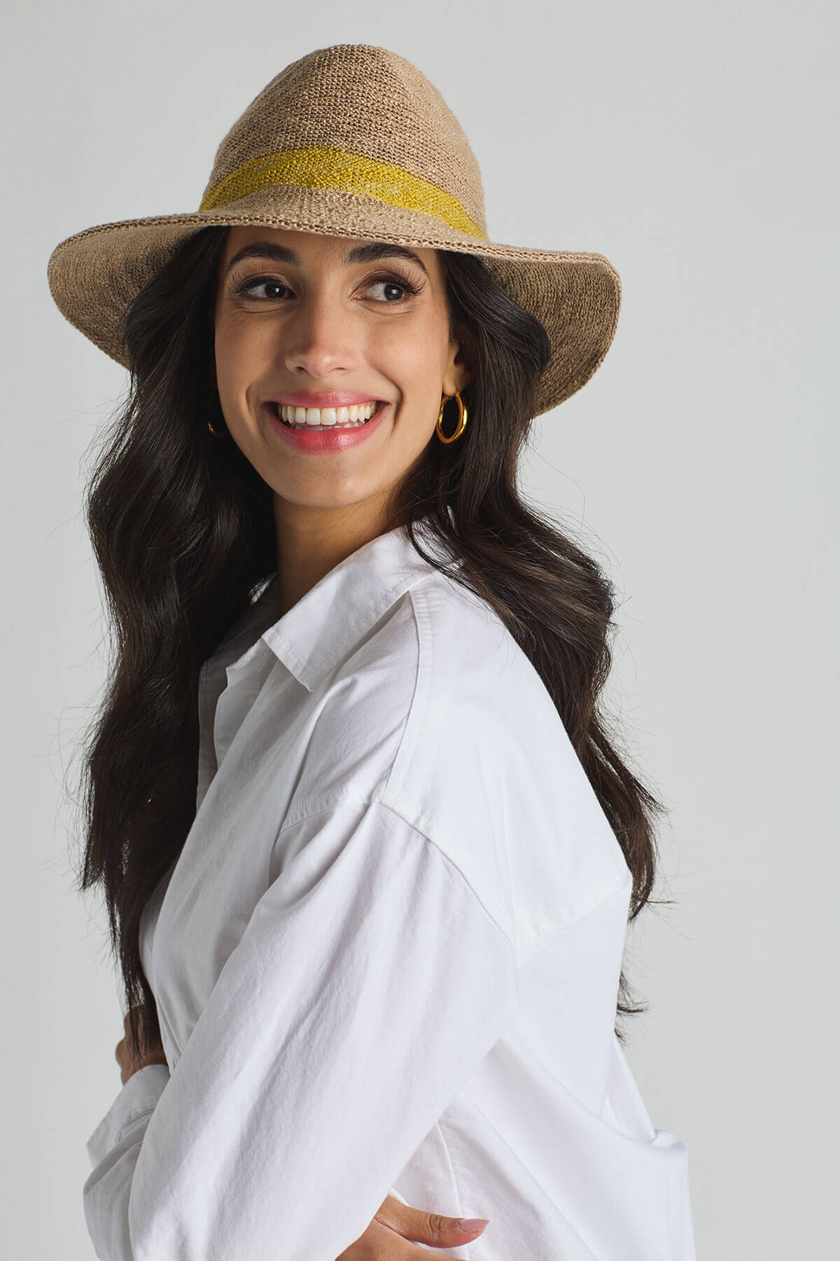 This stylish hat is a wide – brimmed, classic fedora crafted from a textured, woven natural fiber. Its light – brown/beige color is accented by a bright yellow band around the crown. Packable and lightweight, it’s an ideal accessory for your next warm – weather getaway.