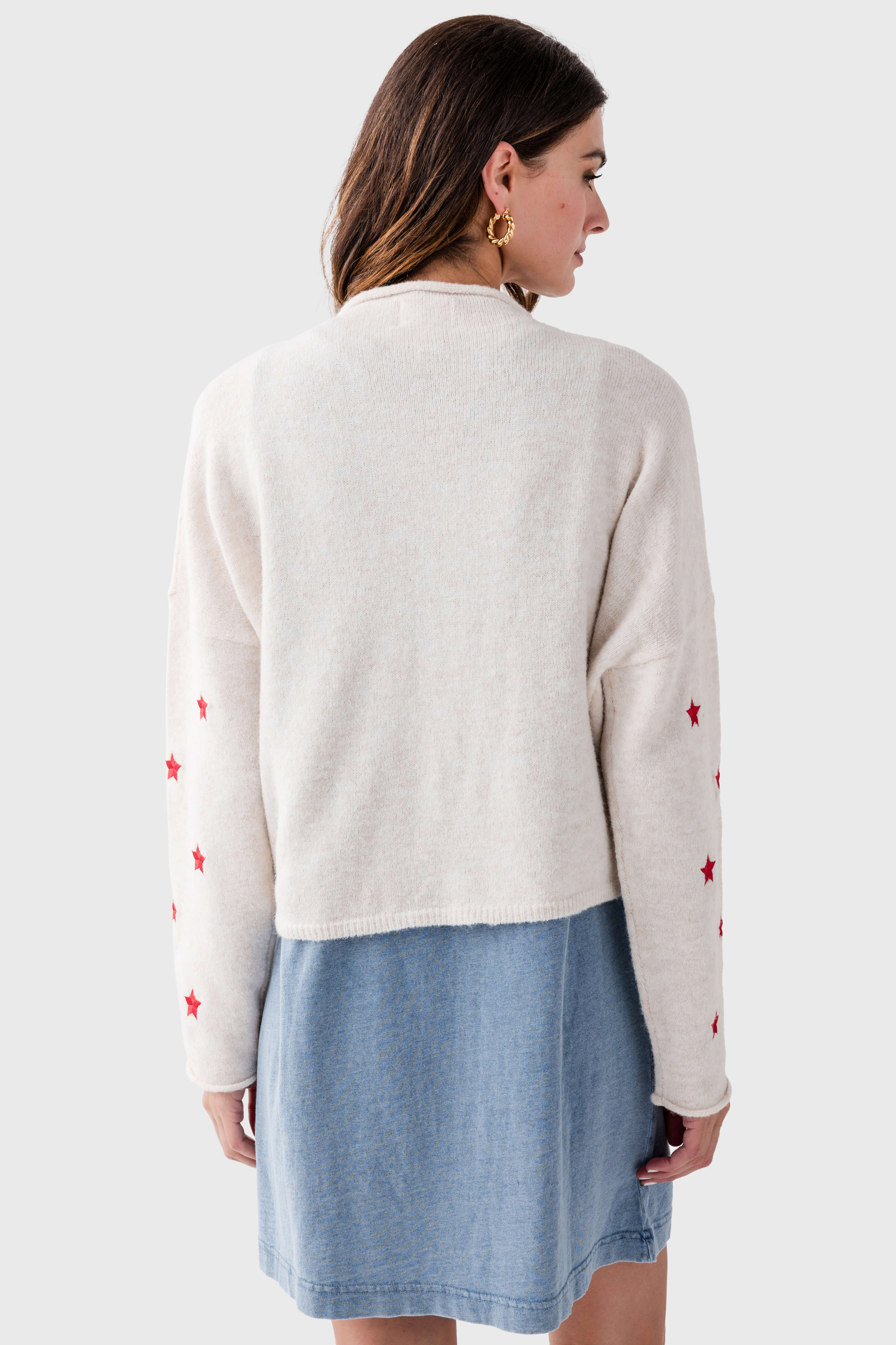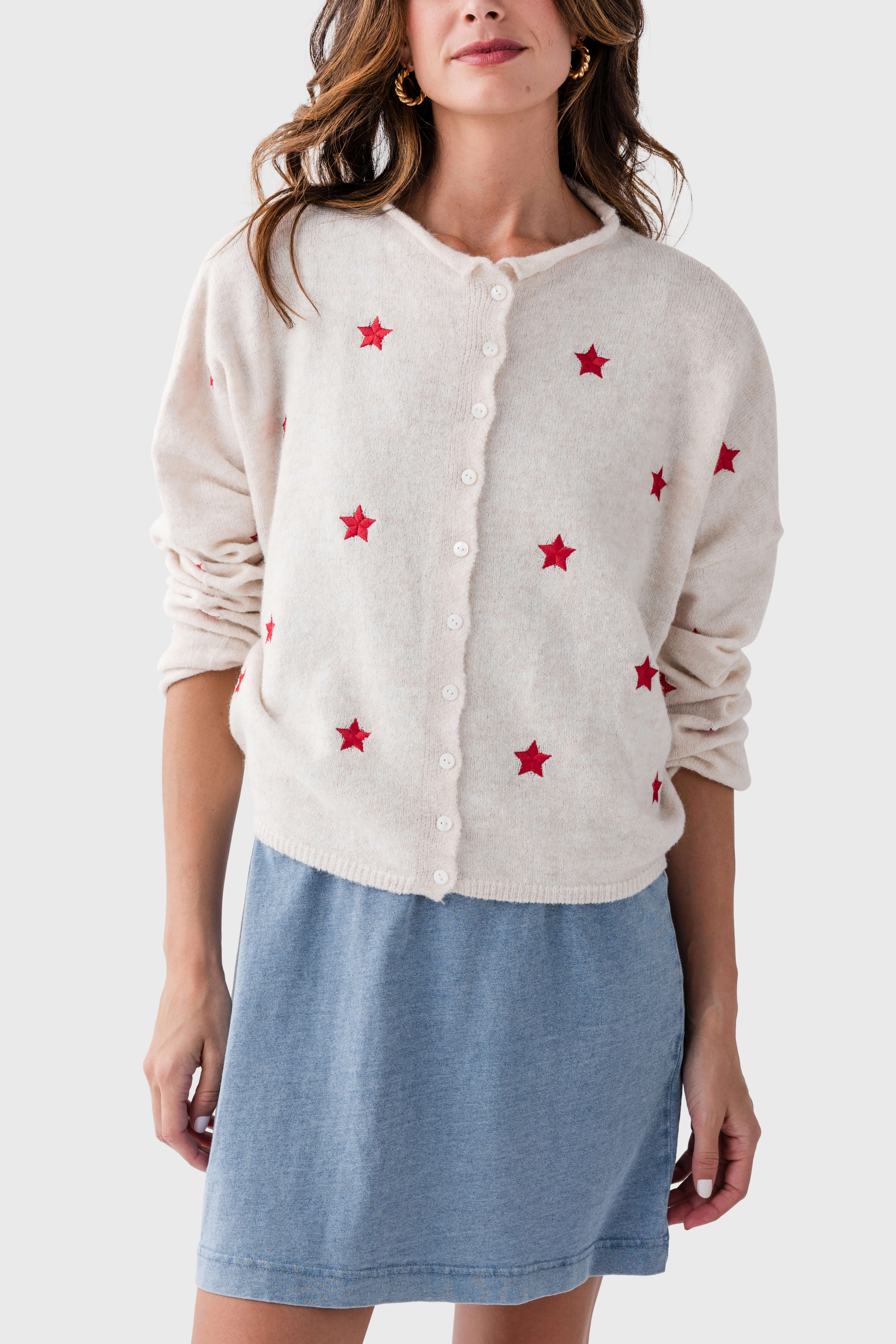 This star-embroidered knit cardigan is a versatile and stylish piece. It features a cream/ivory knit fabric with detailed red star embroidery scattered across the front, sleeves, and hem. It can be worn as a sleeveless shawl or buttoned up as a long – sleeved cardigan, making it a great addition for different looks.