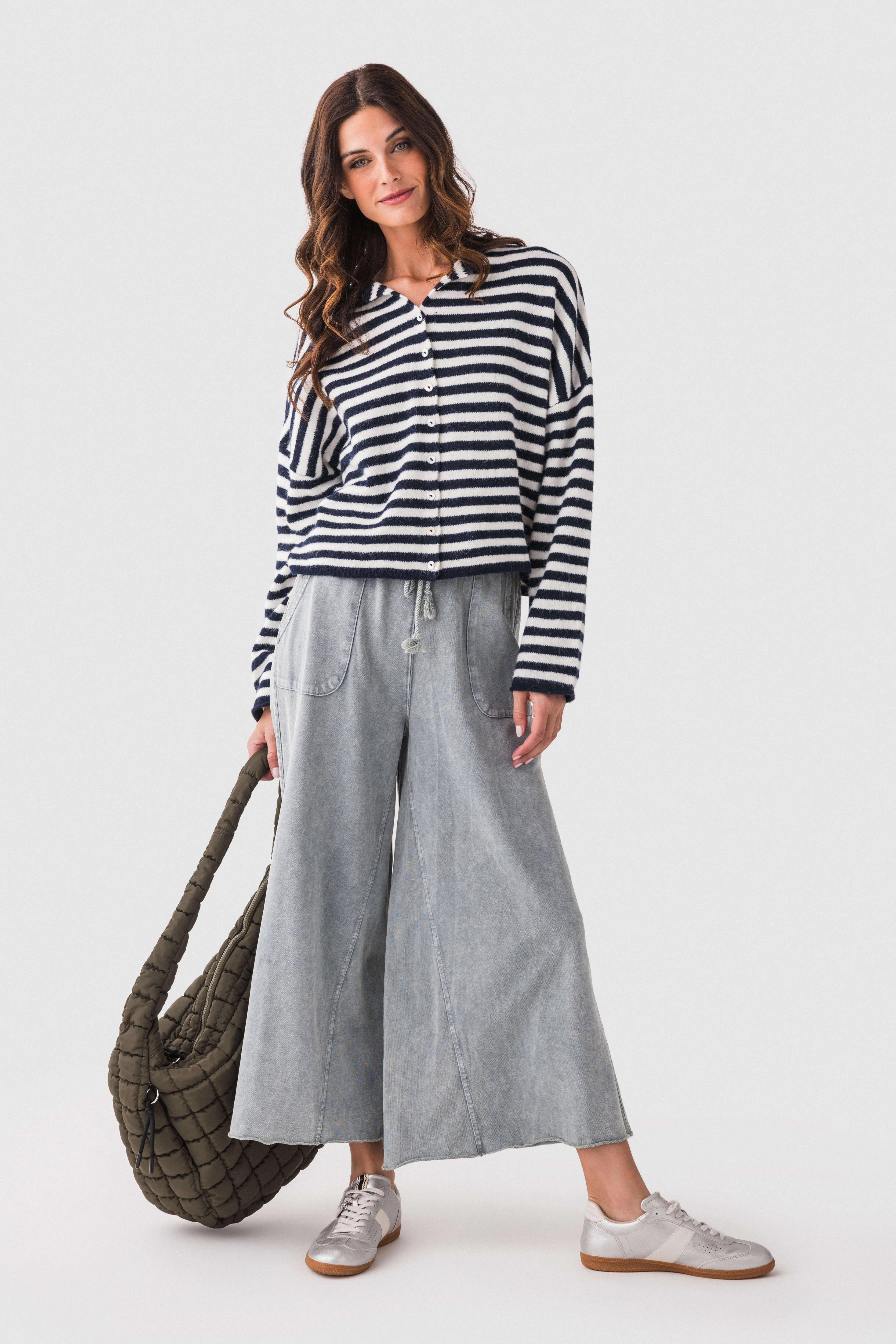 This button – front striped cardigan is a stylish and comfortable addition to your wardrobe. It features an oversized, batwing – style silhouette with long sleeves and a cropped or hip – length hem. Made of a soft, fuzzy knit fabric, it’s perfect for cooler weather, available in multiple colorways of horizontal stripes.