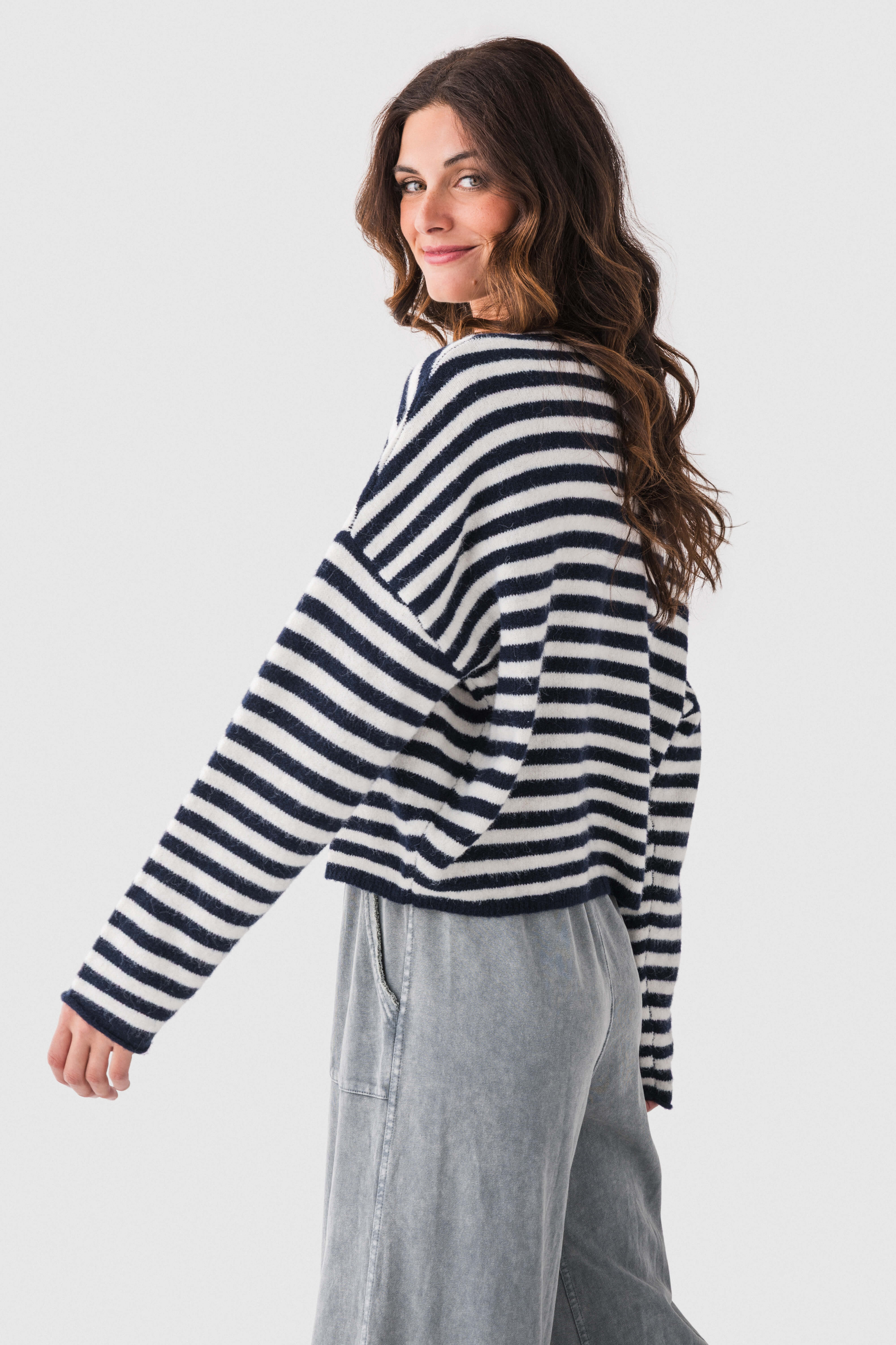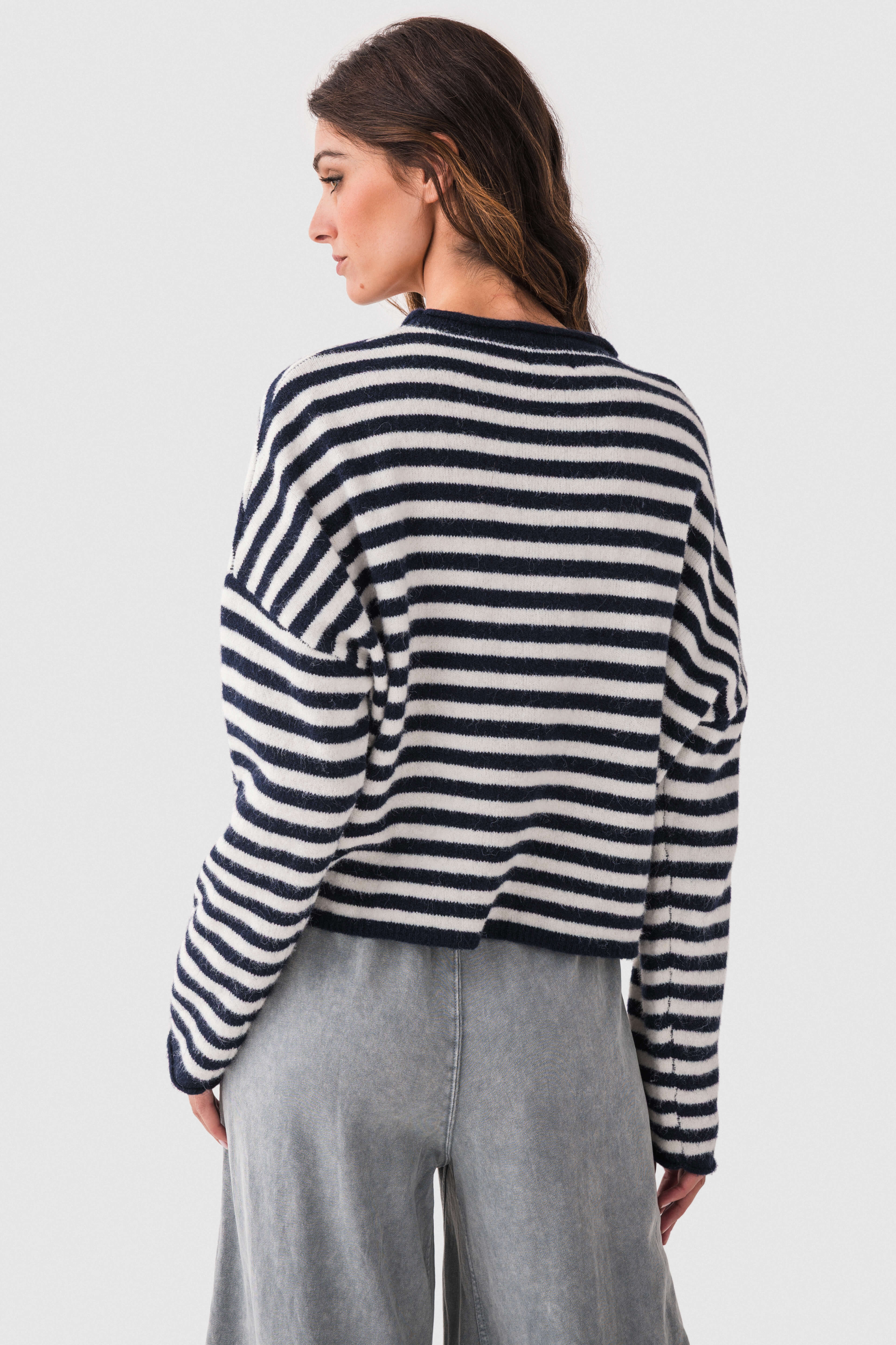 - Thick, warm knit with horizontal stripes for a classic and versatile look