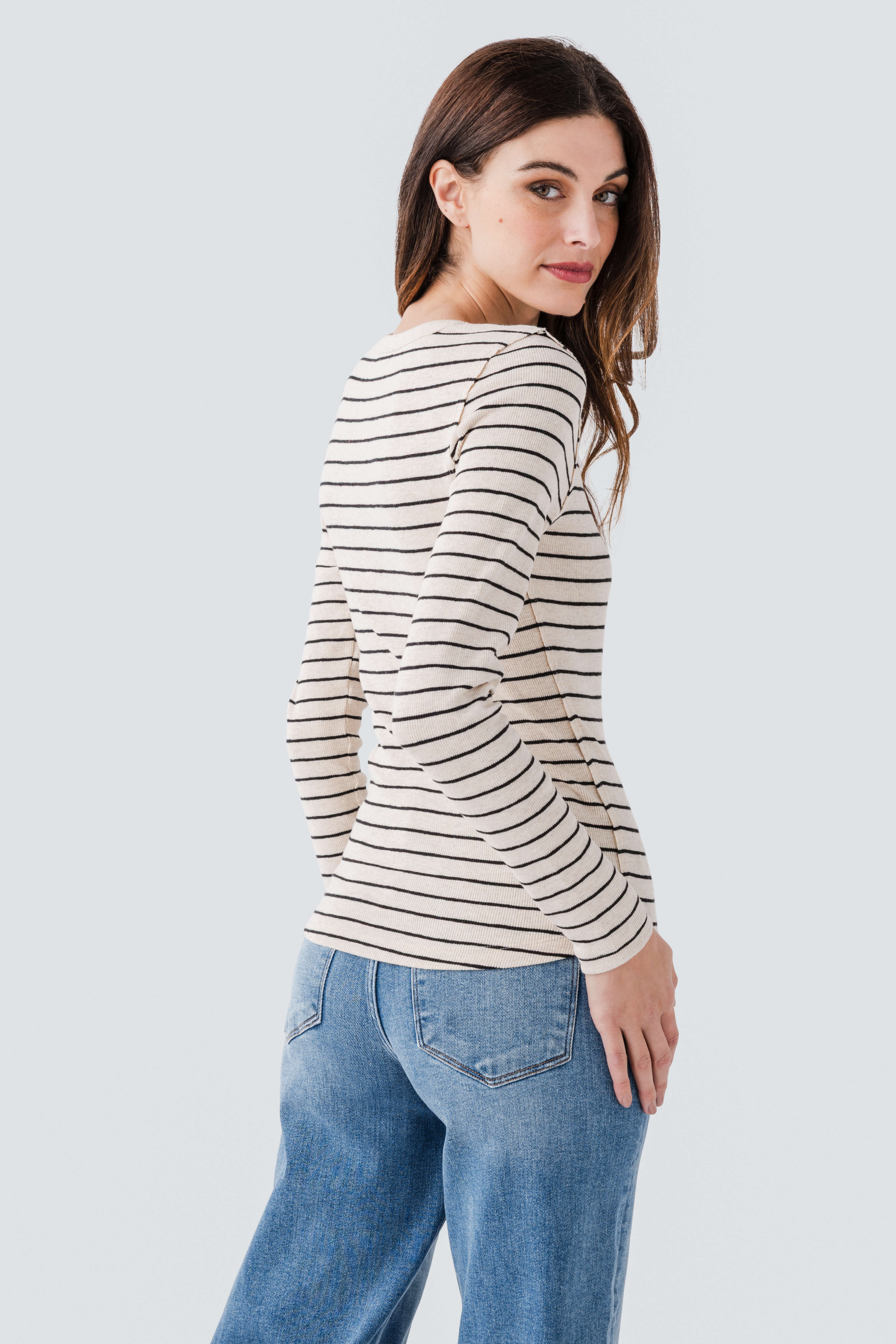 This women’s long – sleeve henley top is a must – have for casual wear. It features a form – fitting silhouette with horizontal black stripes on a light oatmeal heather base color. The soft, stretchy knit fabric and ribbed texture at the neckline and cuffs add to its comfort and style.