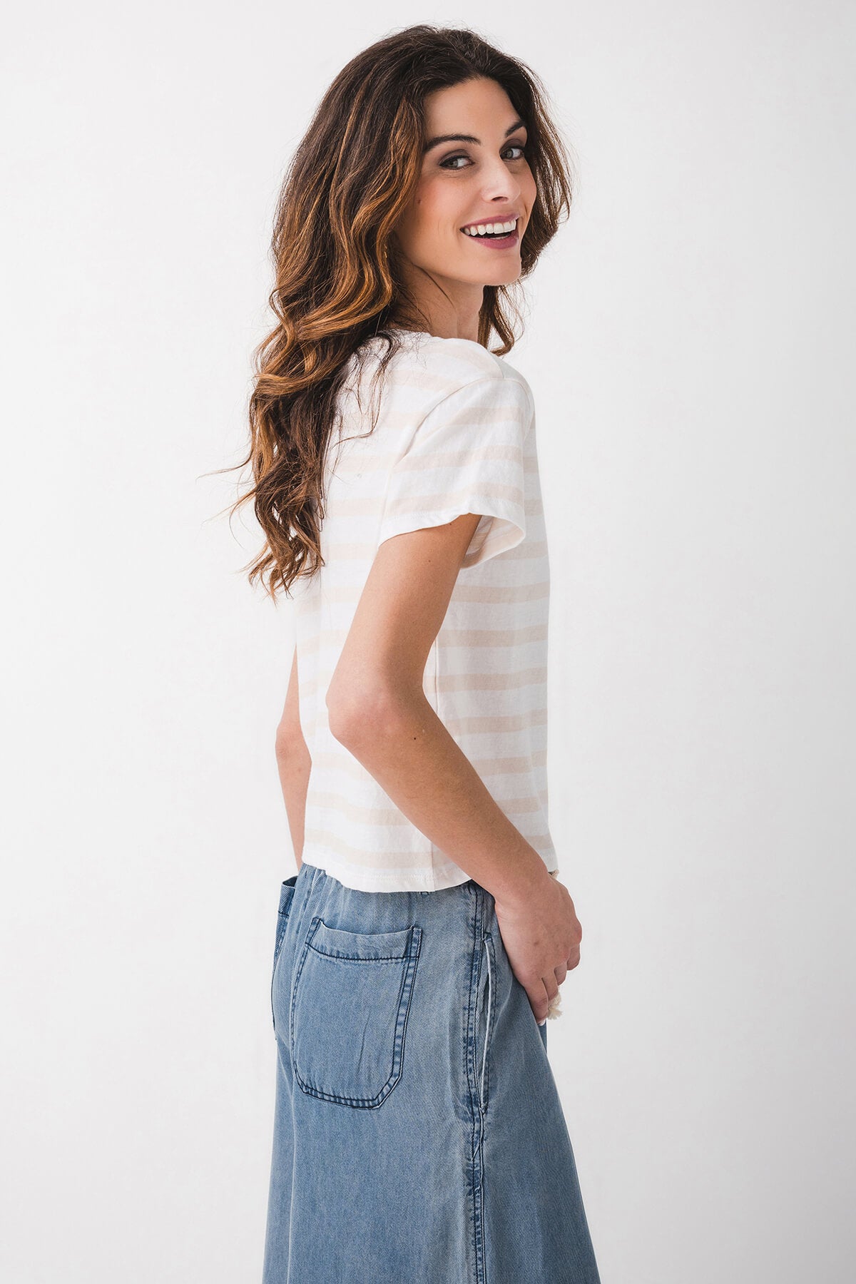 This women’s casual short-sleeved cropped t-shirt is a trendy addition to any wardrobe. With a white base and pale beige horizontal stripes, it features a crew neck and short sleeves. The cropped length is perfect for pairing with high-waisted bottoms like the wide-leg denim pants it’s shown with, offering a fashionable and comfortable look for everyday wear.