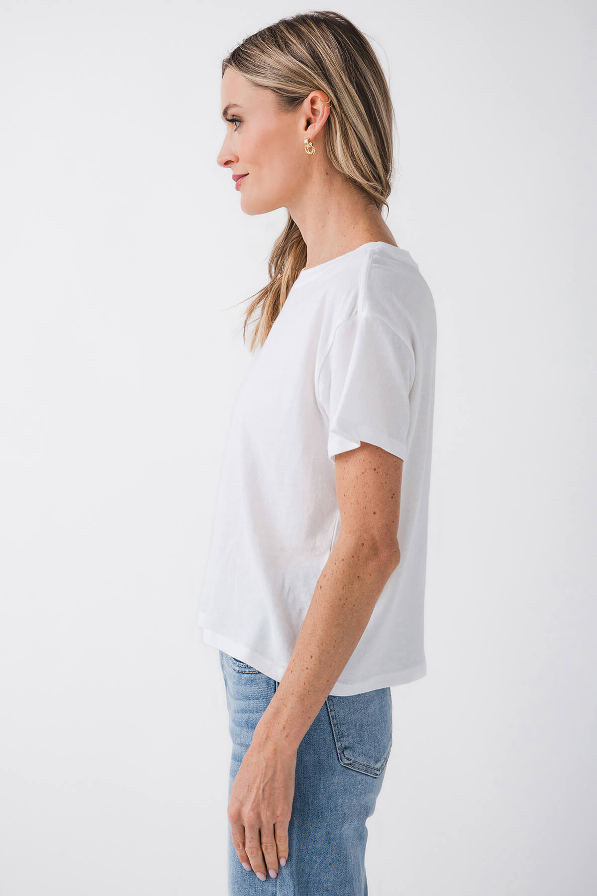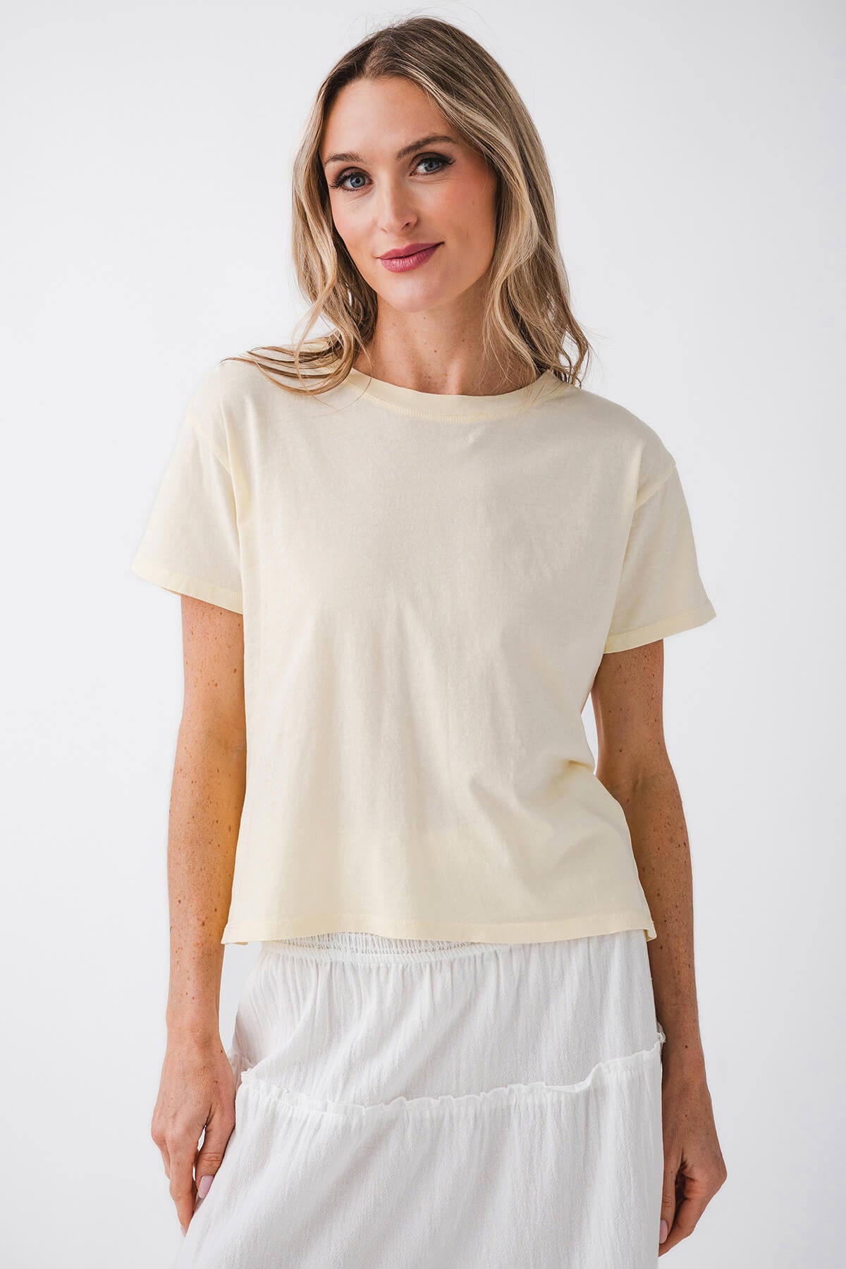 This short – sleeve t – shirt is a versatile piece for casual wear. It comes in two classic colors, white and mellow yellow. With its crew neck, short sleeves, and relaxed cropped silhouette, it can be easily paired with various bottoms like high – waisted jeans, shorts, or skirts.